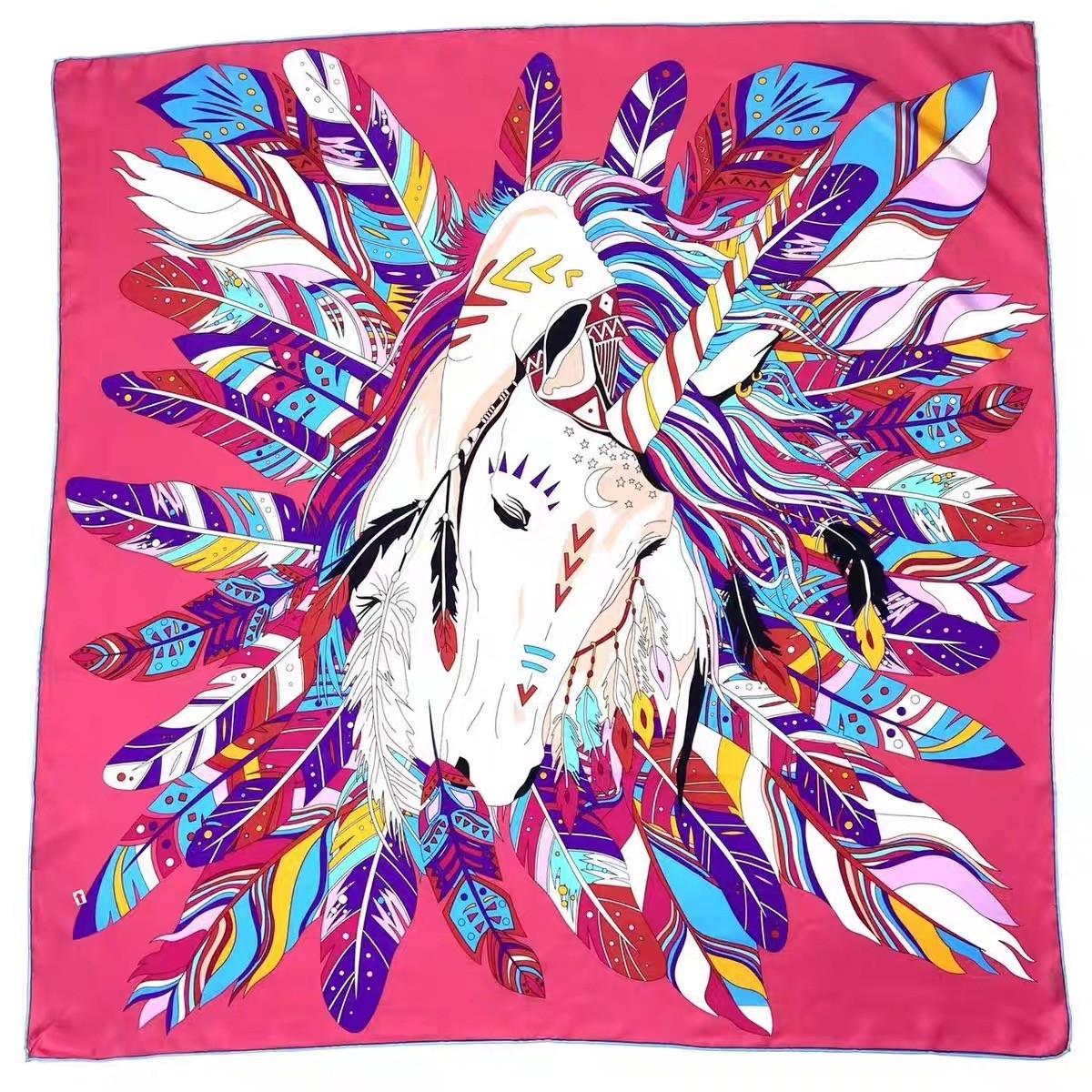 как выглядит 35"x35"Pink Colorful Feather Print Pure Mulberry Twill 16momme Silk Scarf88x88cm фото