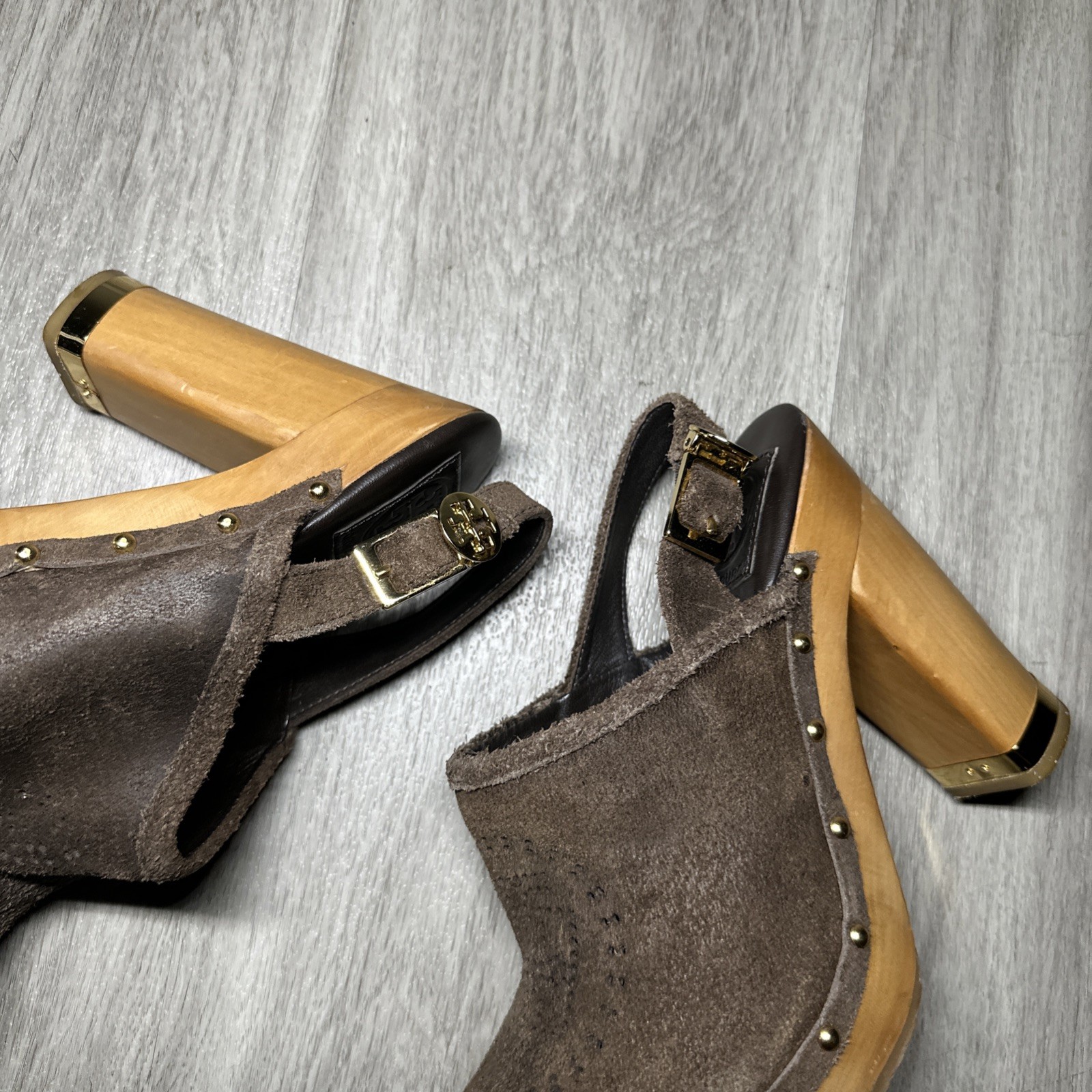 как выглядит Tory Burch Women s Brayden Brown Suede Block Heel Slingback Clogs US 7.5 фото