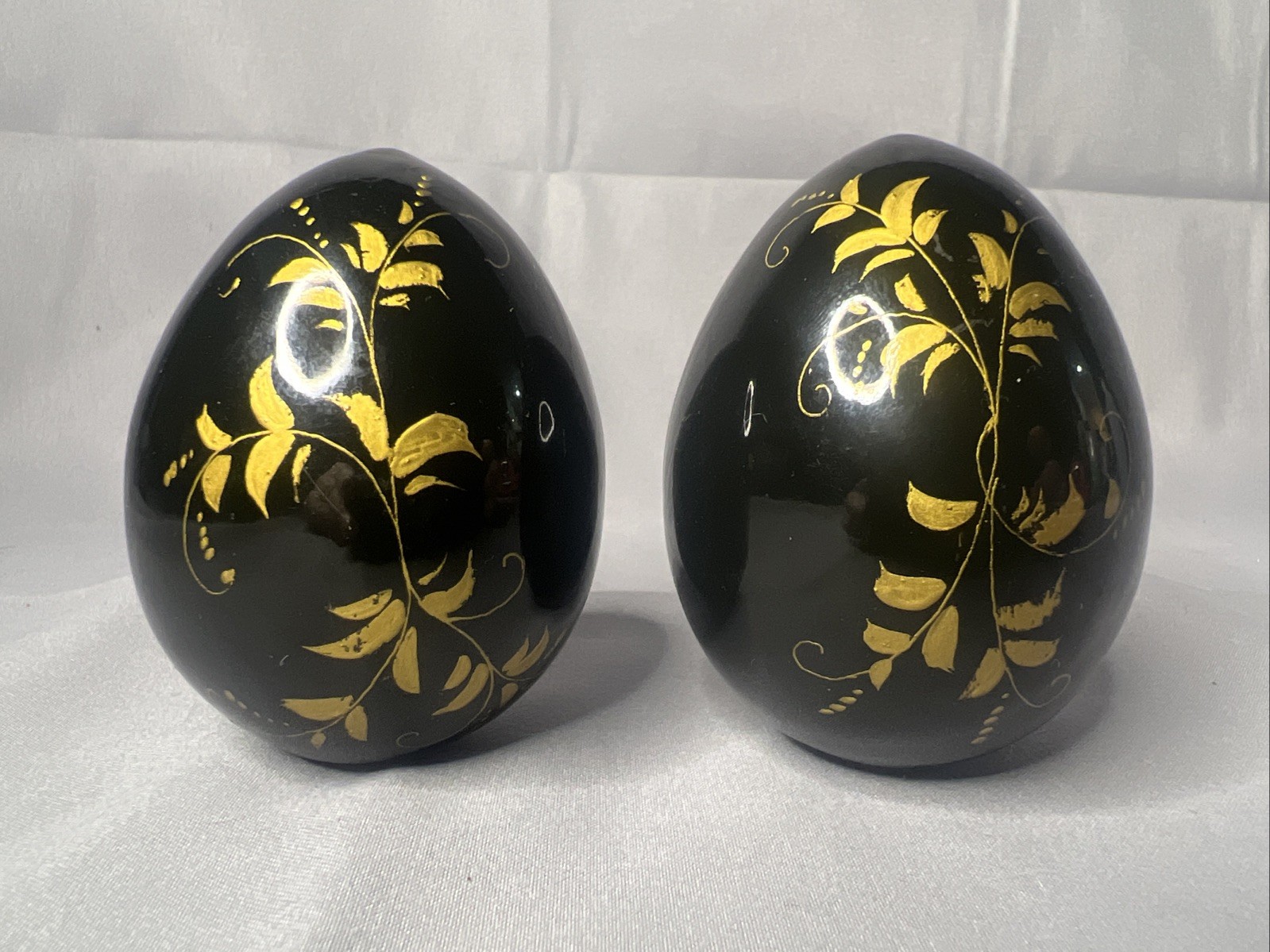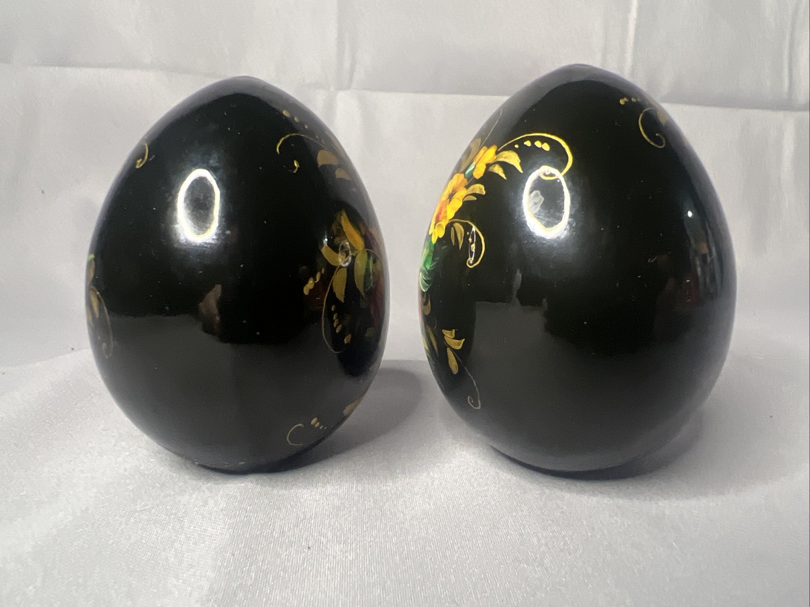 • Vintage Pair Of Russian Wooden Hand Painted Lacquered Eggs Signed Black Flowers
