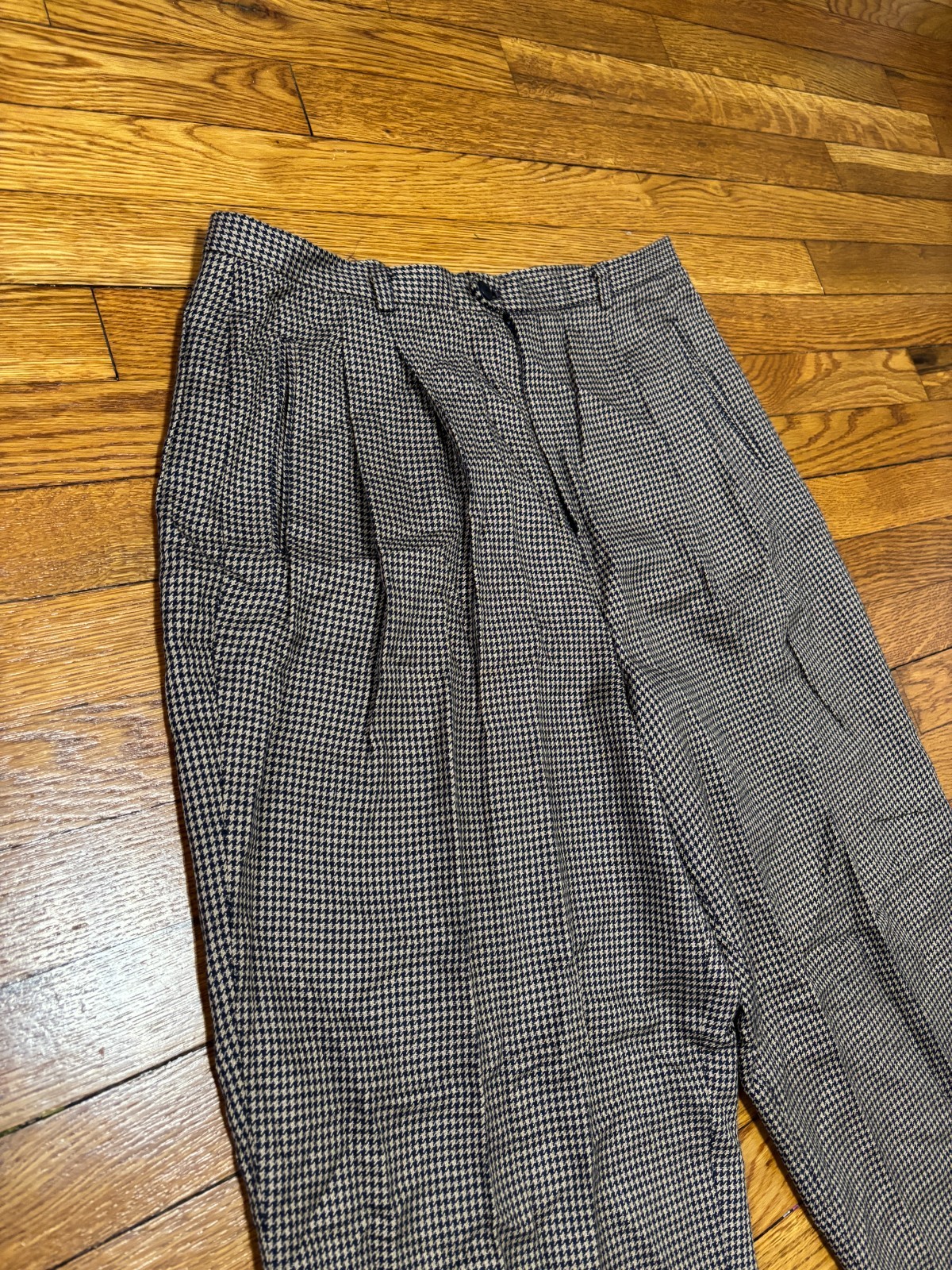 Vintage Orvis Womens Pants Sz 16 Tan Blue Houndstooth Pleated Rayon Pool Trouser