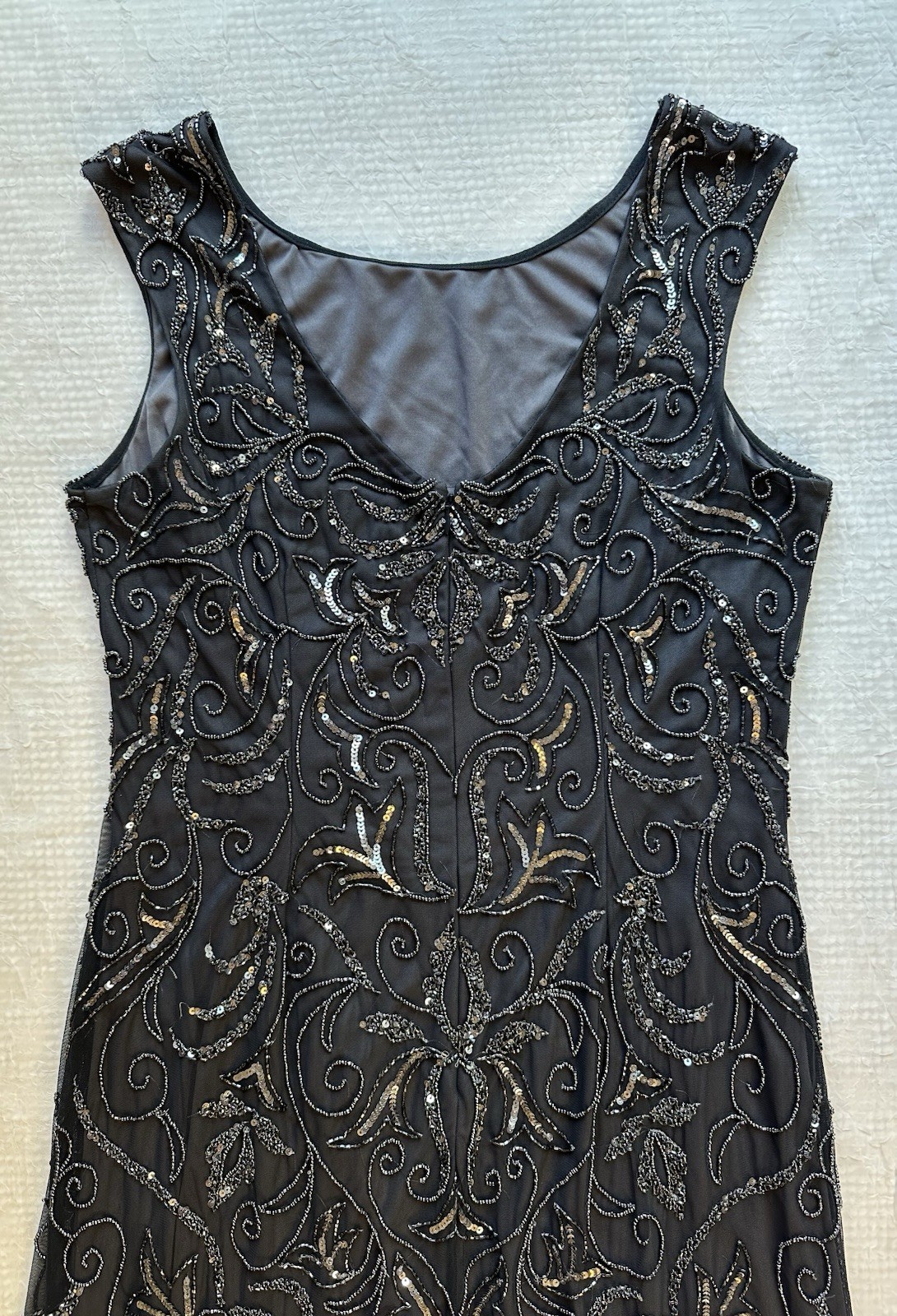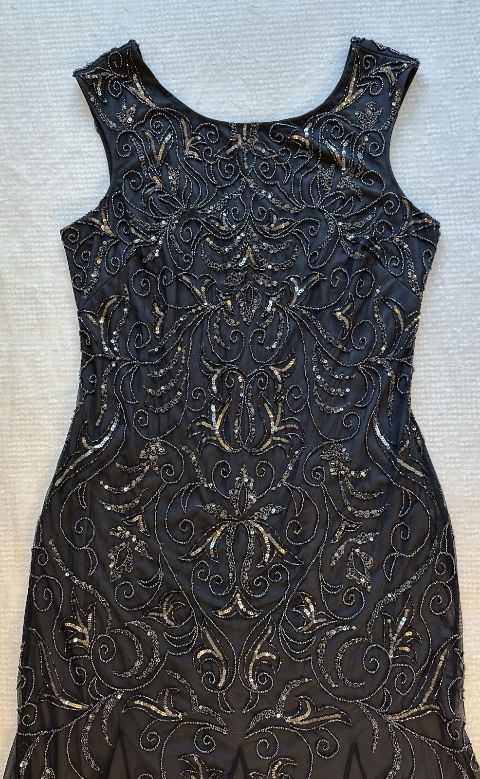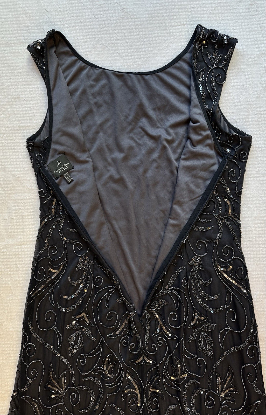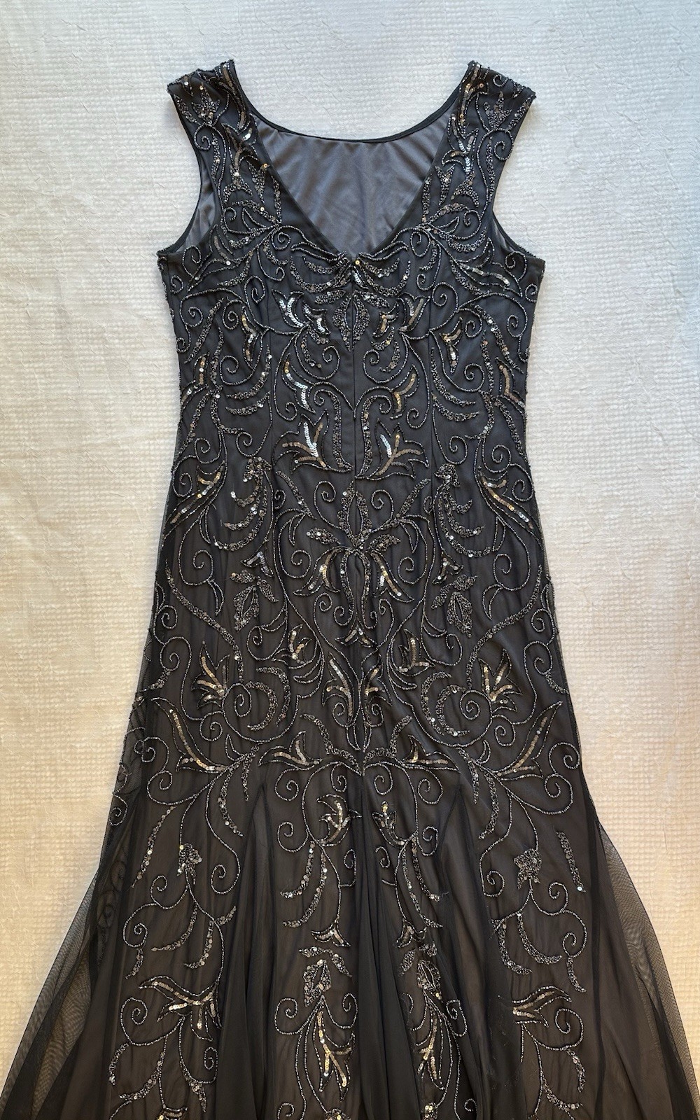 Adrianna Papell Charcoal Beaded Gown Mesh Overalay Formal Full Length Dress 14