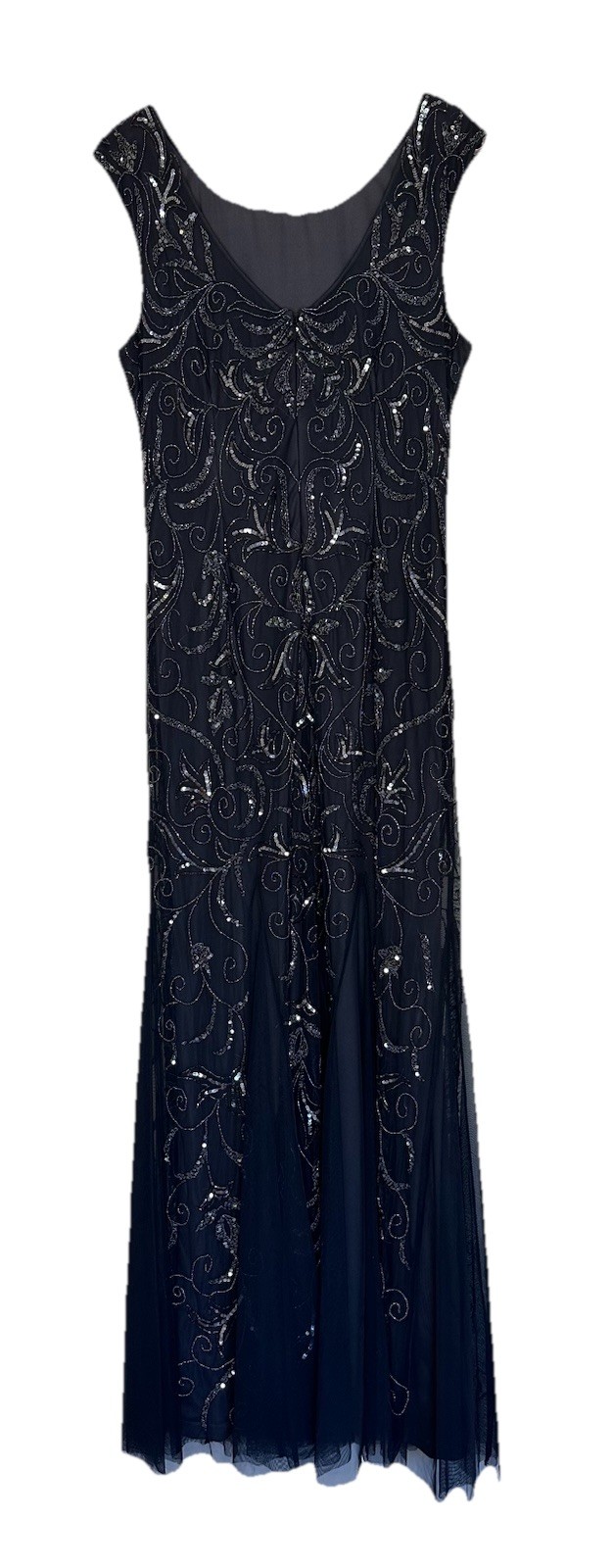 как выглядит Adrianna Papell Charcoal Beaded Gown Mesh Overalay Formal Full Length Dress 14 фото