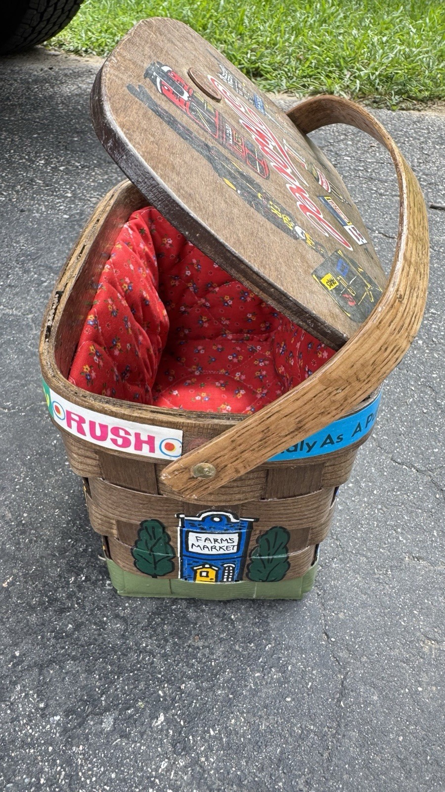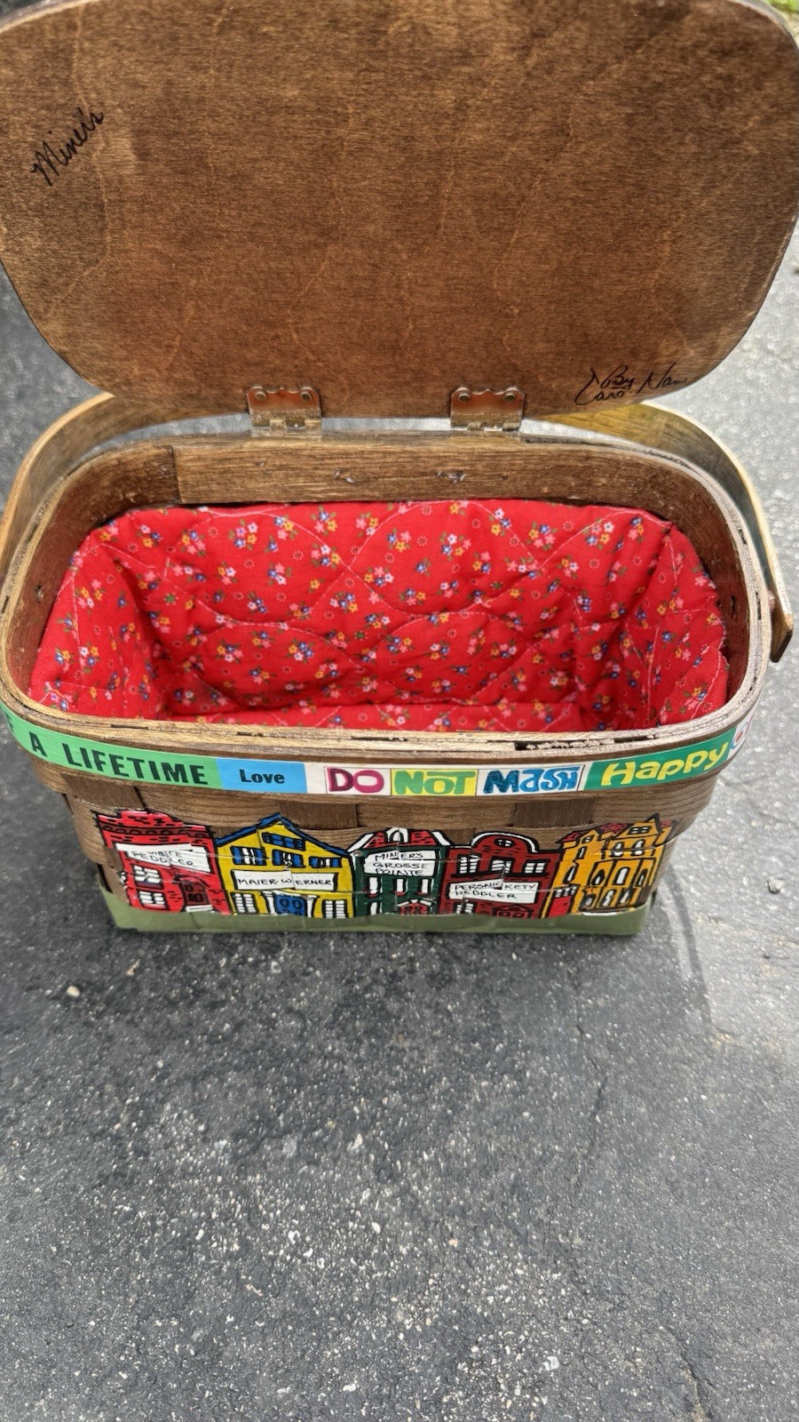 как выглядит Vintage Caro Nan Hand-Painted Wooden Basket Purse with Town Scene 1965 фото