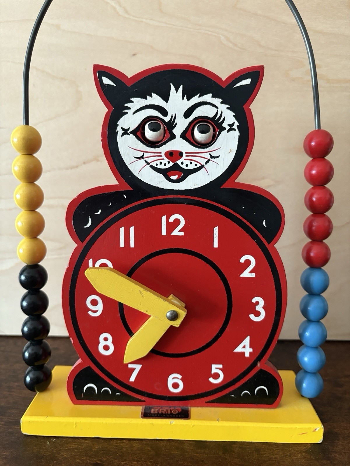 Vintage Brio Made In Sweden Wooden Rolling Eyes Cat Abacus Beads Toy Clock