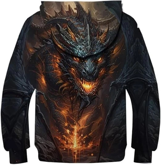 Black Dragon Hoodie Gothic Fantasy Pullover Sweatshirt with Fiery Design