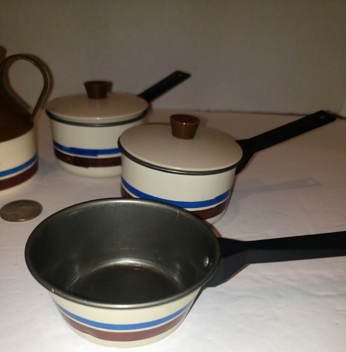 как выглядит 9PC VINTAGE CHILTON KIDS BLUE BROWN KITCHENWARE SET ALUMINUM POTS PANS COFFEE фото