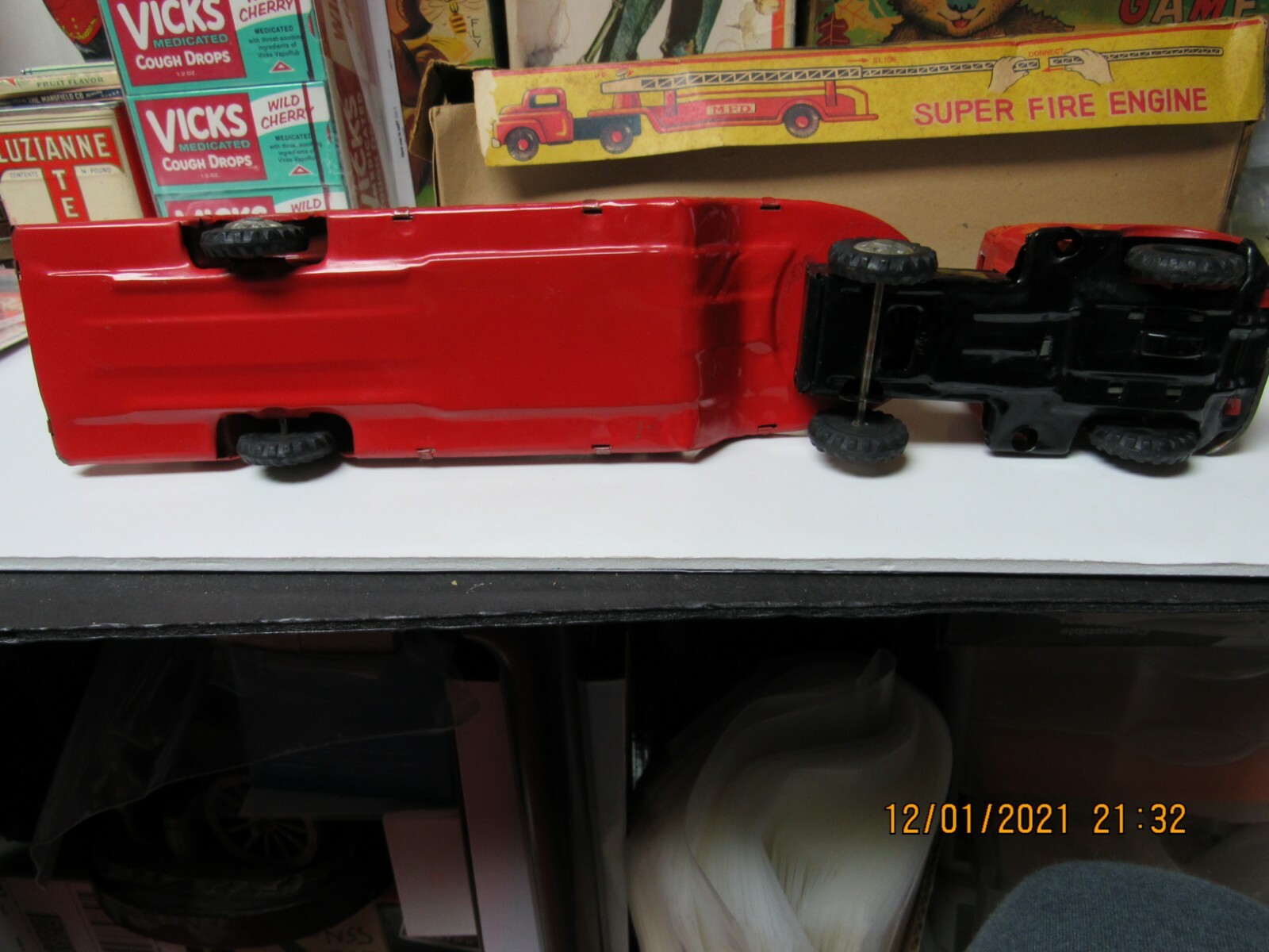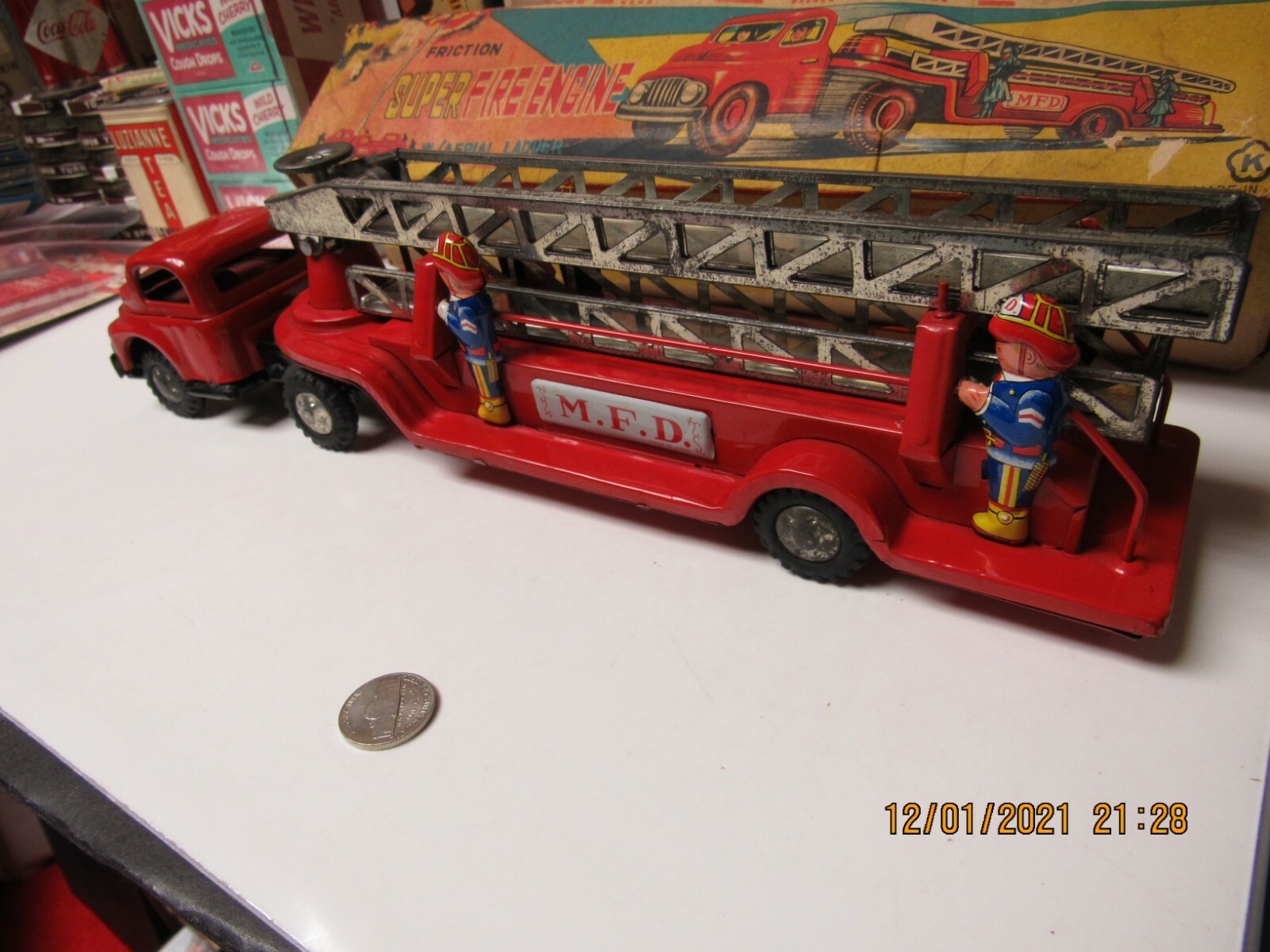 как выглядит SUPER FIRE ENGINE TRUCK W/ AERIAL LADDER BOXED FRICTION 50s JAPAN WORKS 14.5" EX фото