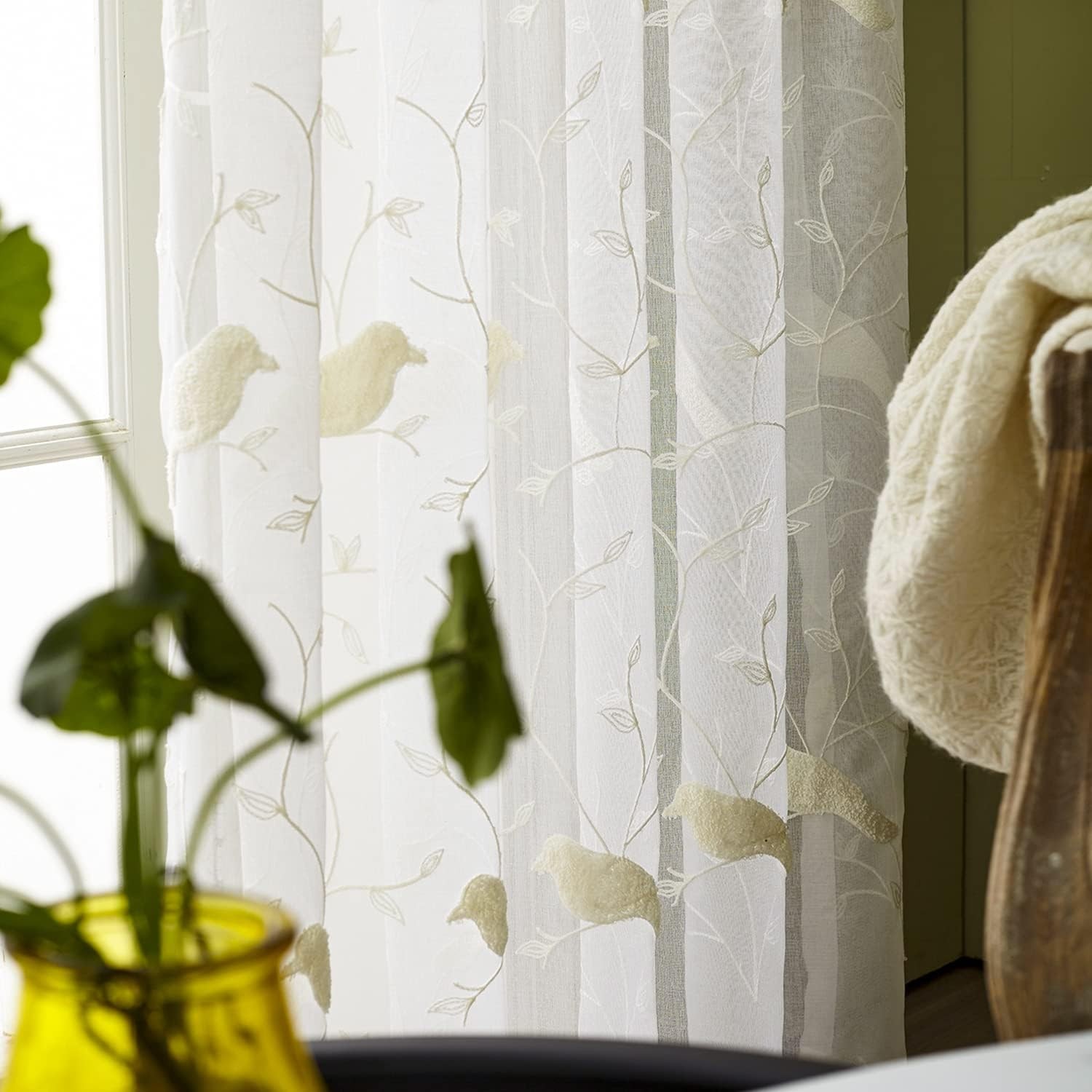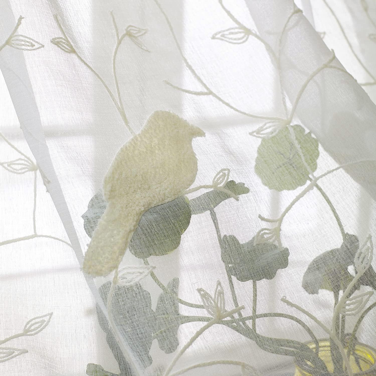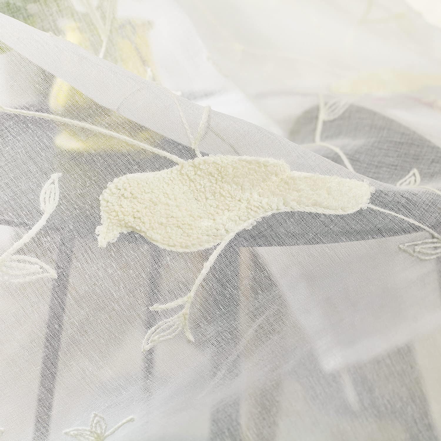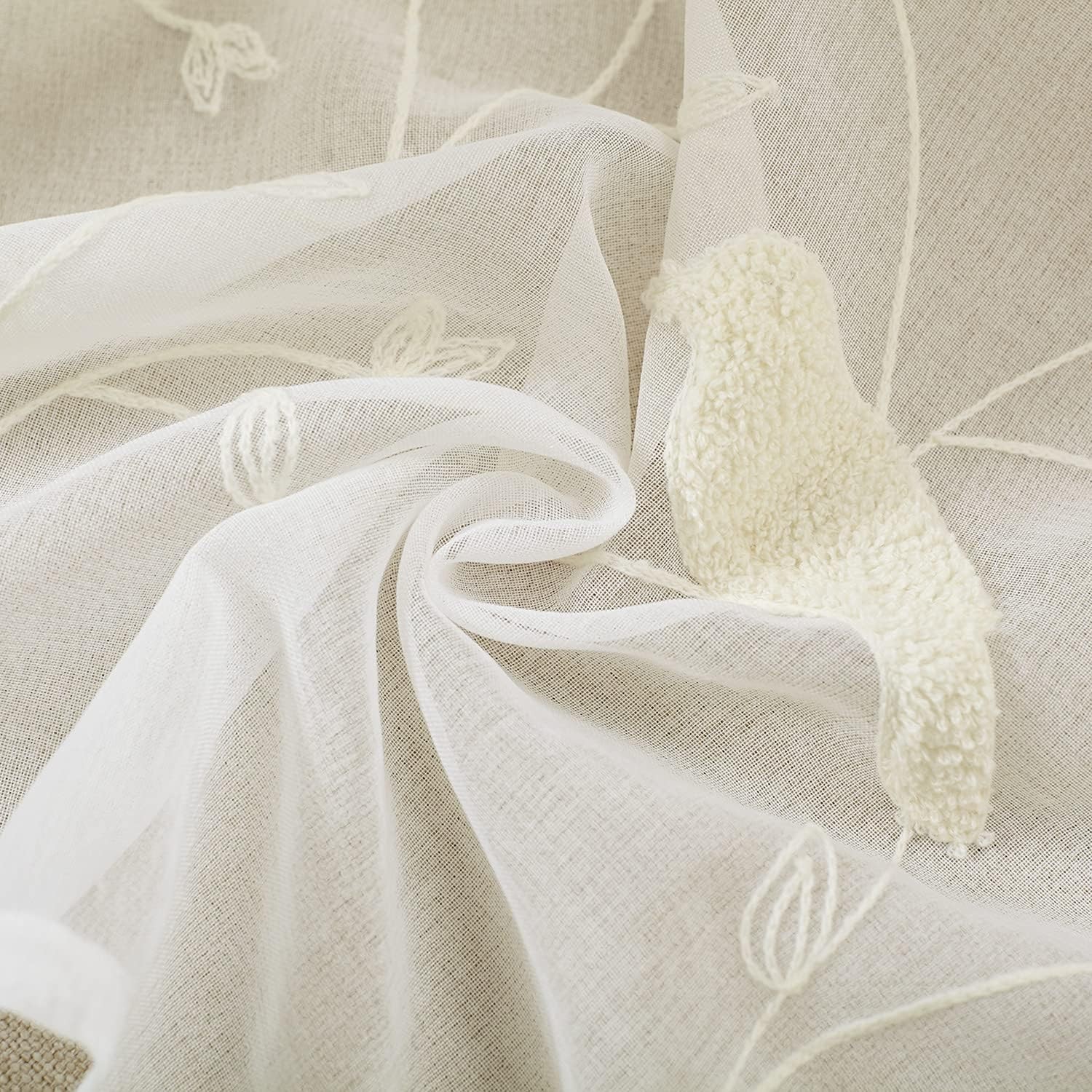 Leeva White Sheer Linen Curtains 96 Inch Long, 52W x 96L Pack of 2 , Birds