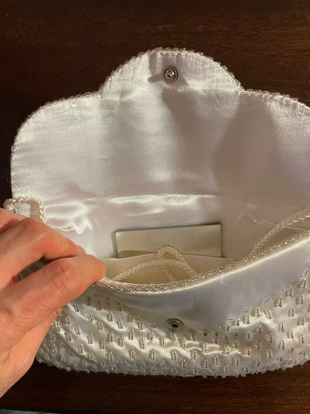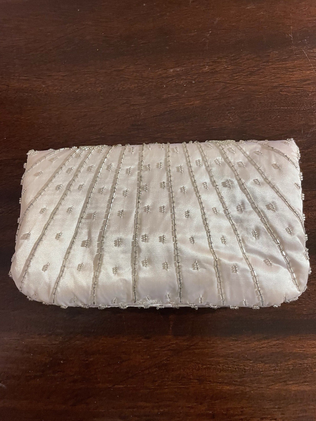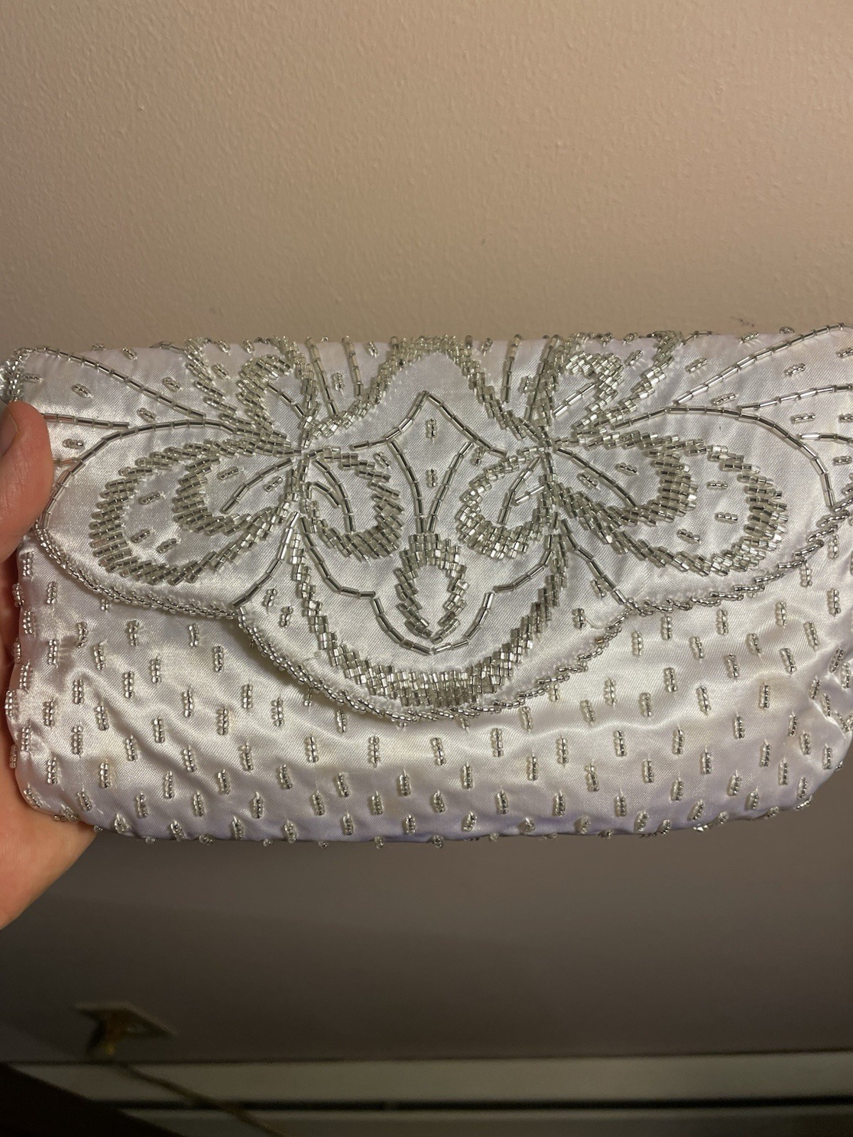 как выглядит Vintage New Magid Beaded Clutch Evening Bag with White Strap and Pocket Mirror фото