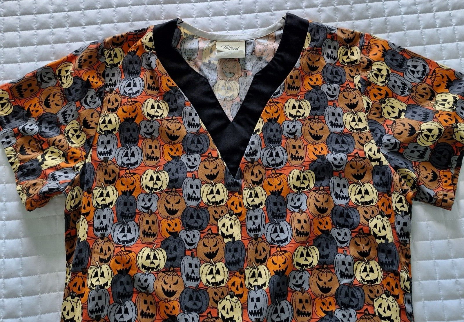 Halloween Thanksgiving Pumpkins Scrub Top Women's Men's Unisex XS V Neck Pockets