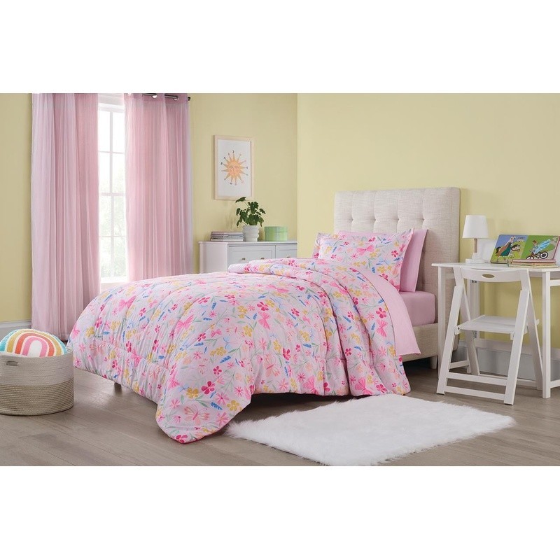 Twin Pink Wildflower Kids Bedding Set Polyester Comforter Bed Sheets 5-Piece