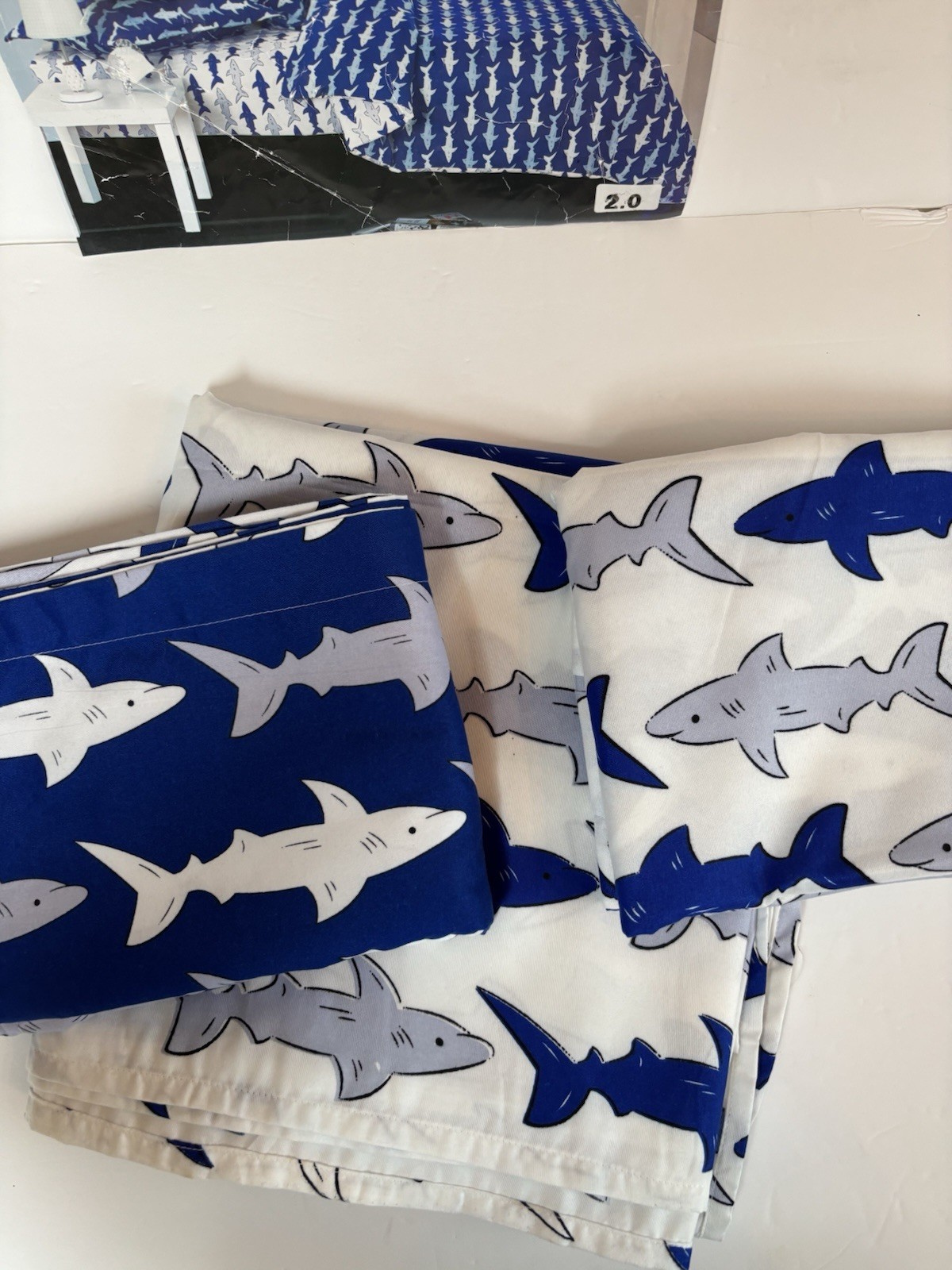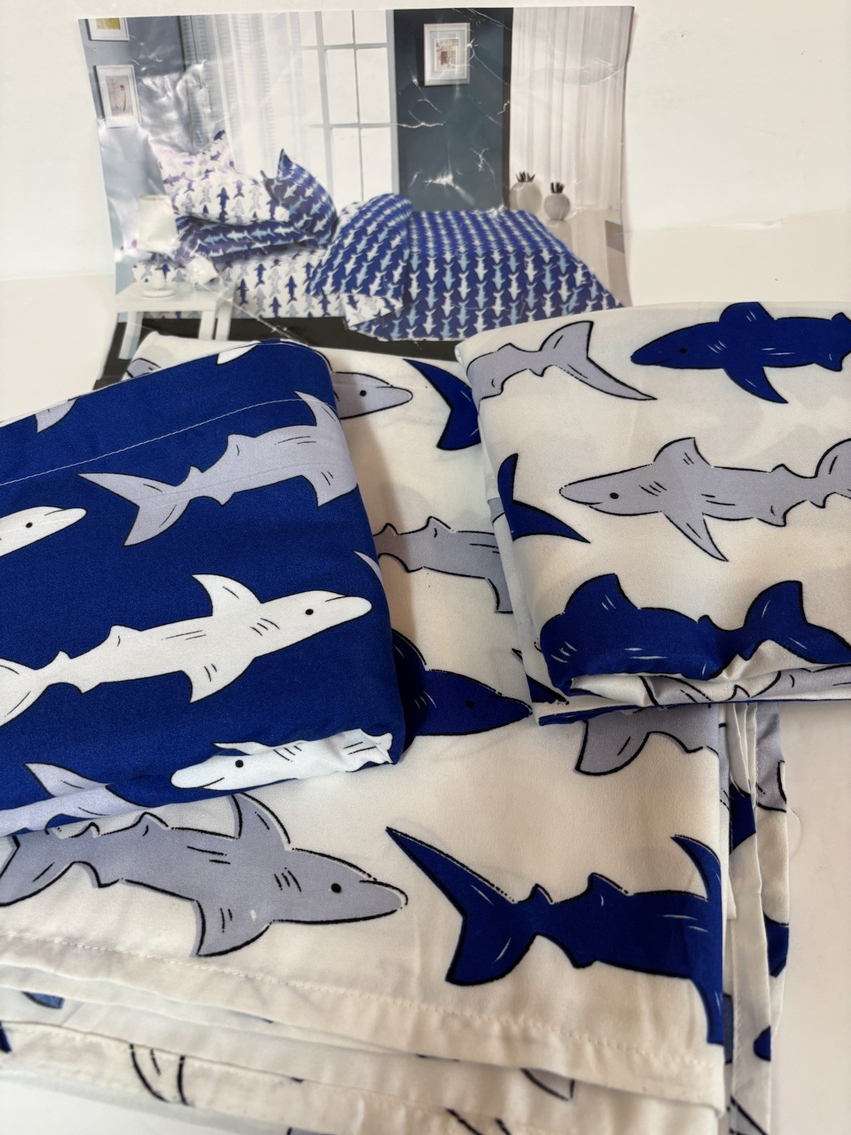 Kids full size flat sheet blue and gray Sharks two shams two pillowcases Poly
