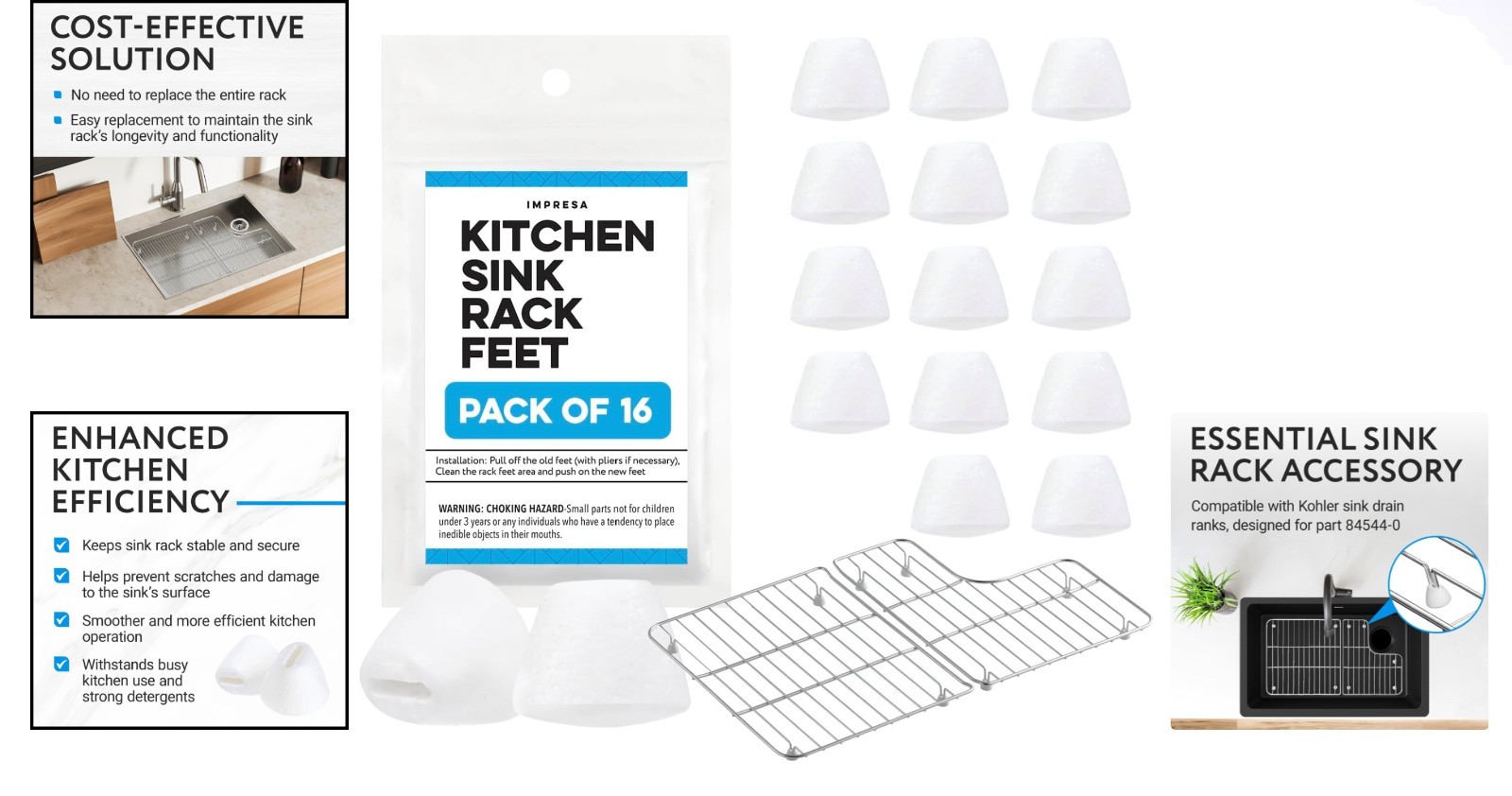 Durable White Rubber Sink Rack Feet - 16-Pack, 0.37 Opening for Kohler Models