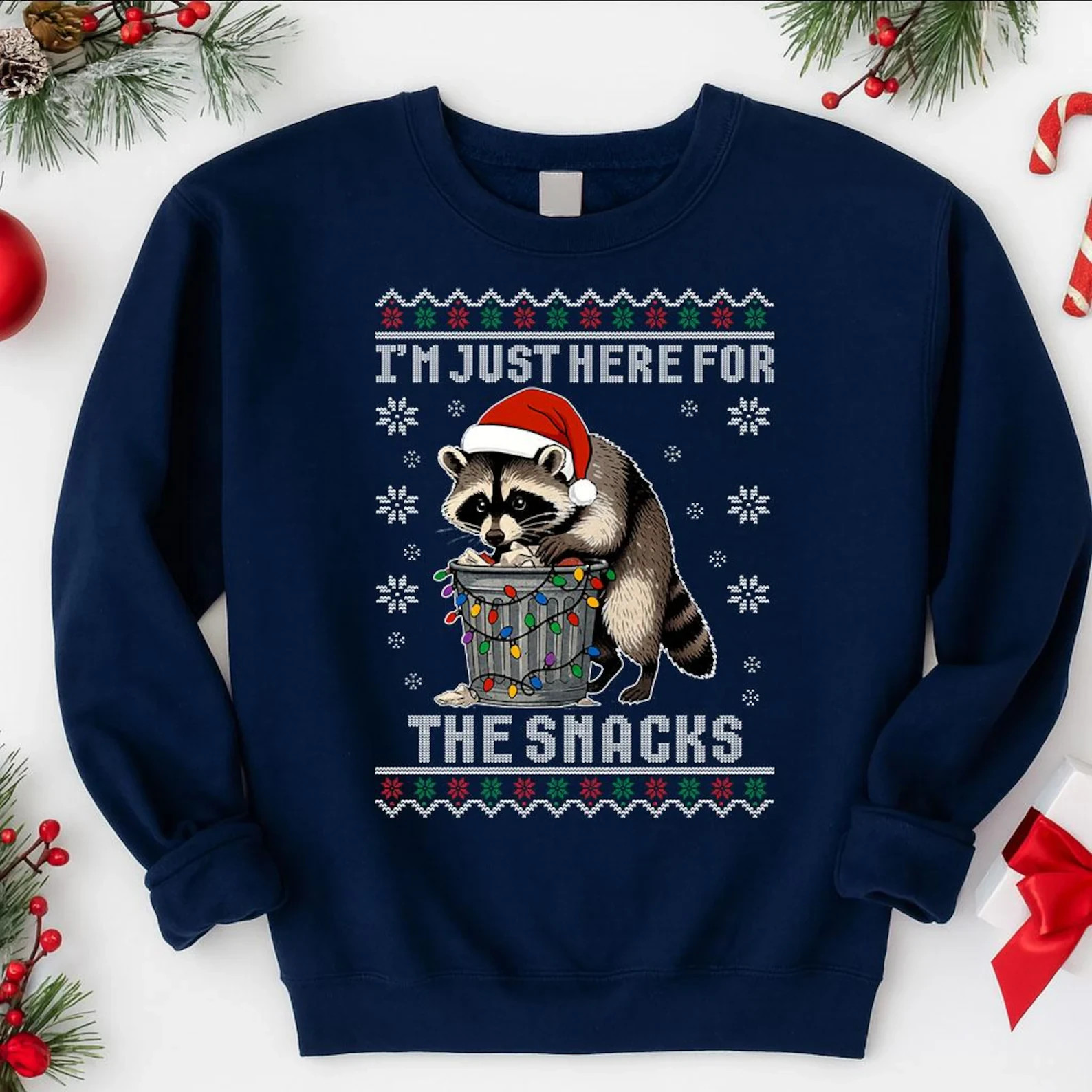 Funny Raccoon Christmas Sweatshirt Here For The Snacks Ugly Holiday Jumper