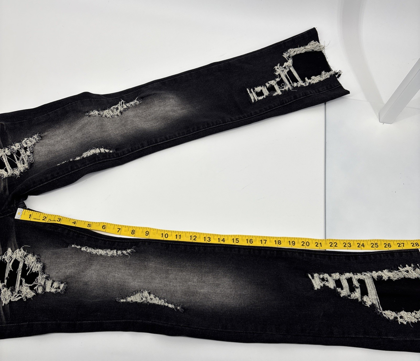 Особенности: Zipper and button front closure, Five pocket style with one being a zipper pocket, Destressing going down leg, Super long to be super stacked, Flared hemlines, Raw hemline, Distressed