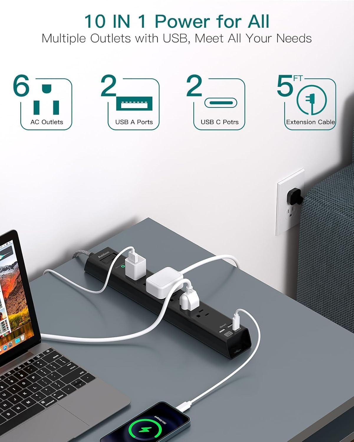 Surge Protector Power Strip - Extension Cord with 6 AC Outlets 4 USB 2 USB-C ...