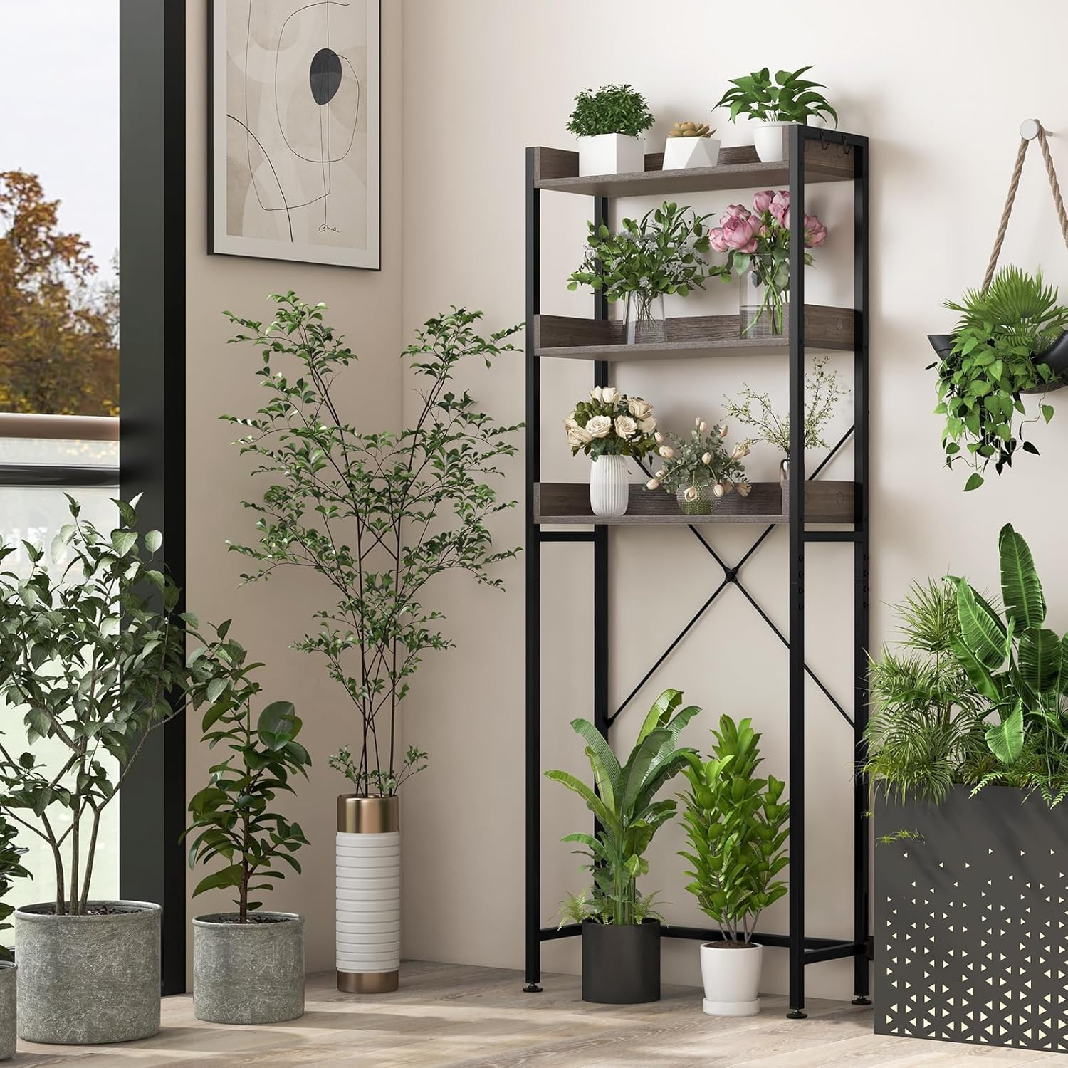 3-Tier Over Toilet Storage Rack with Hooks - Grey Bathroom Organizer Shelf