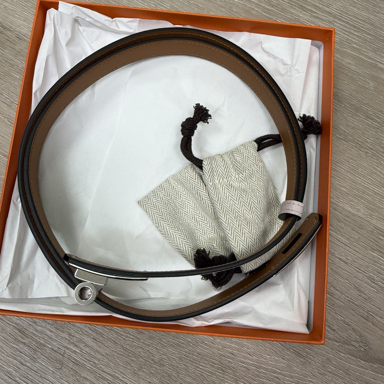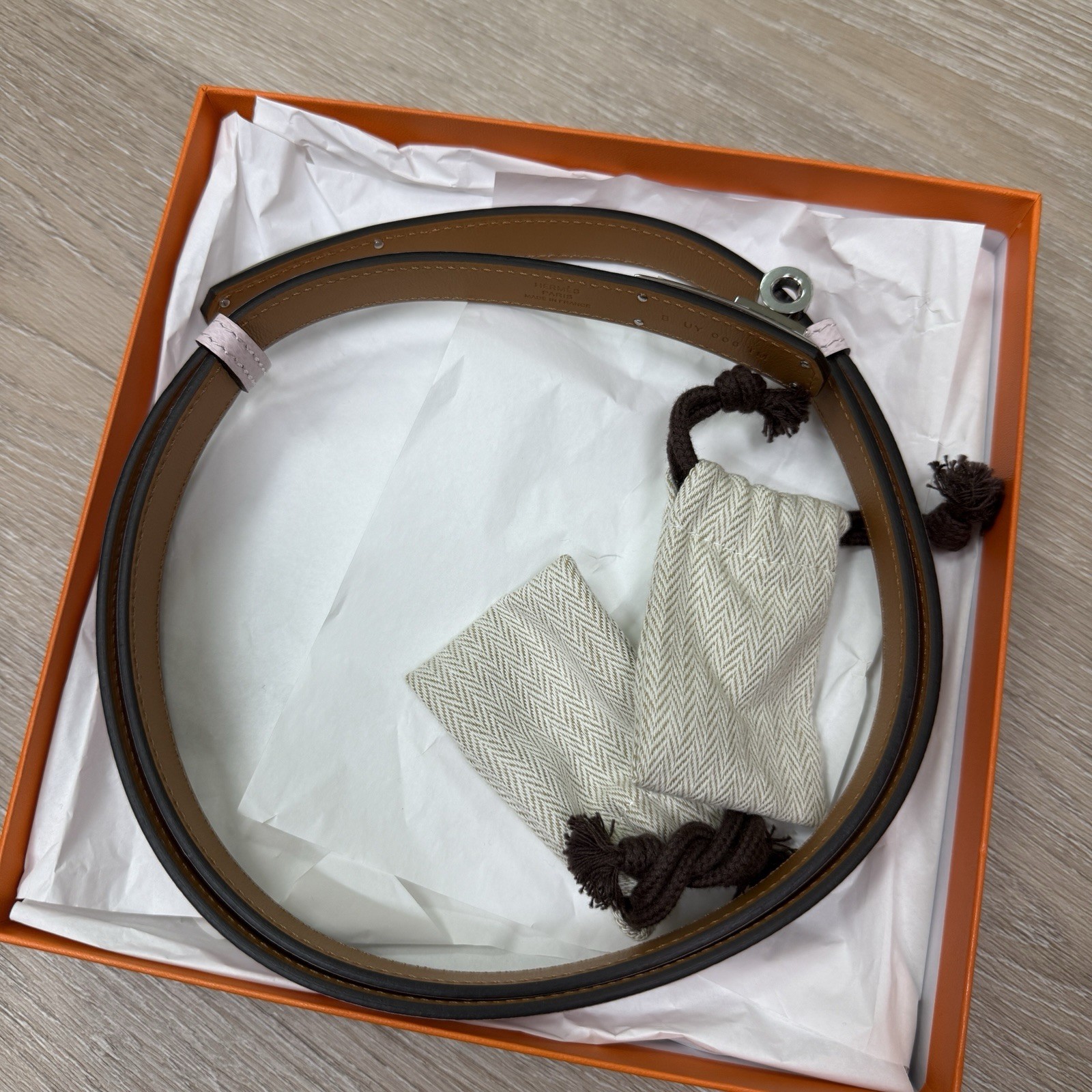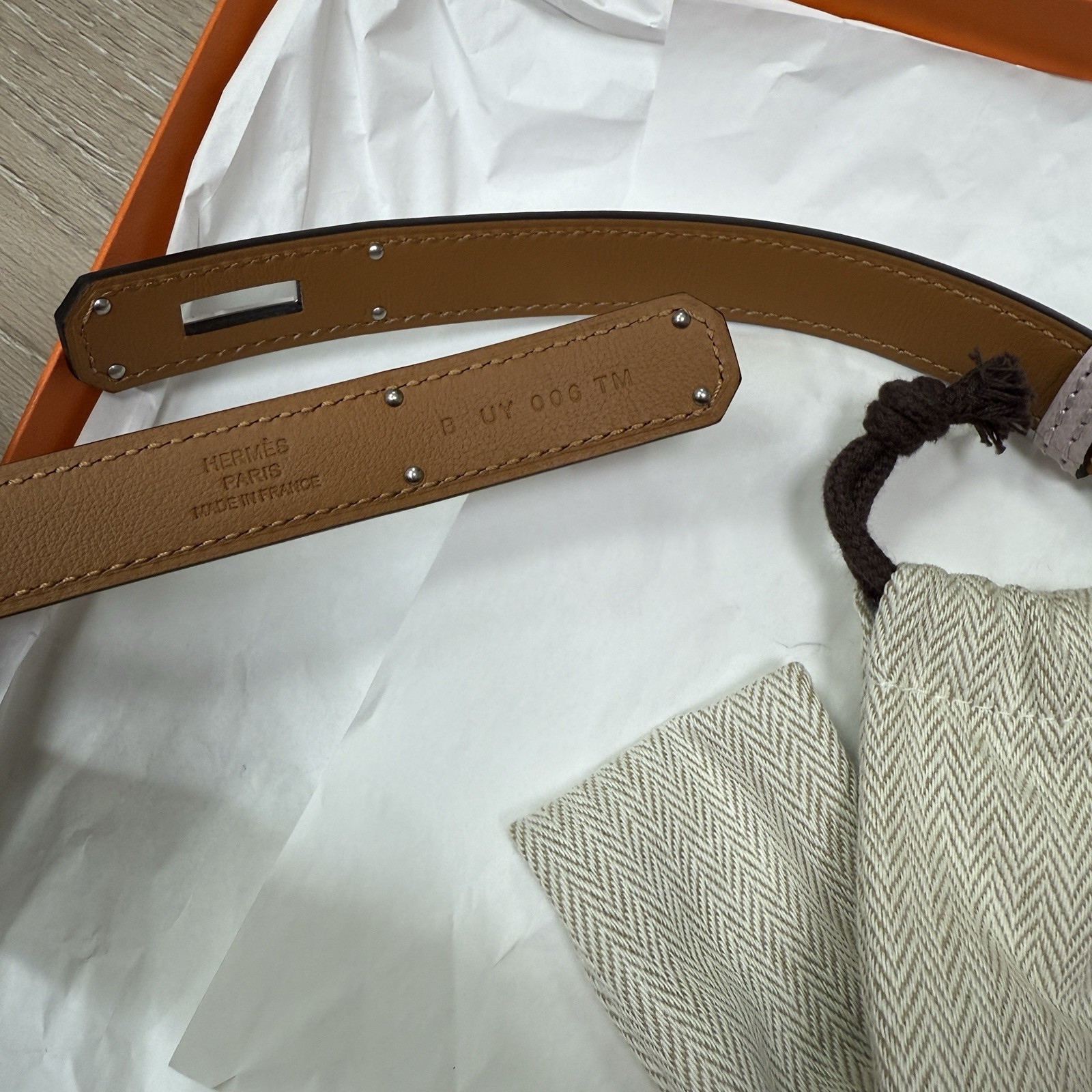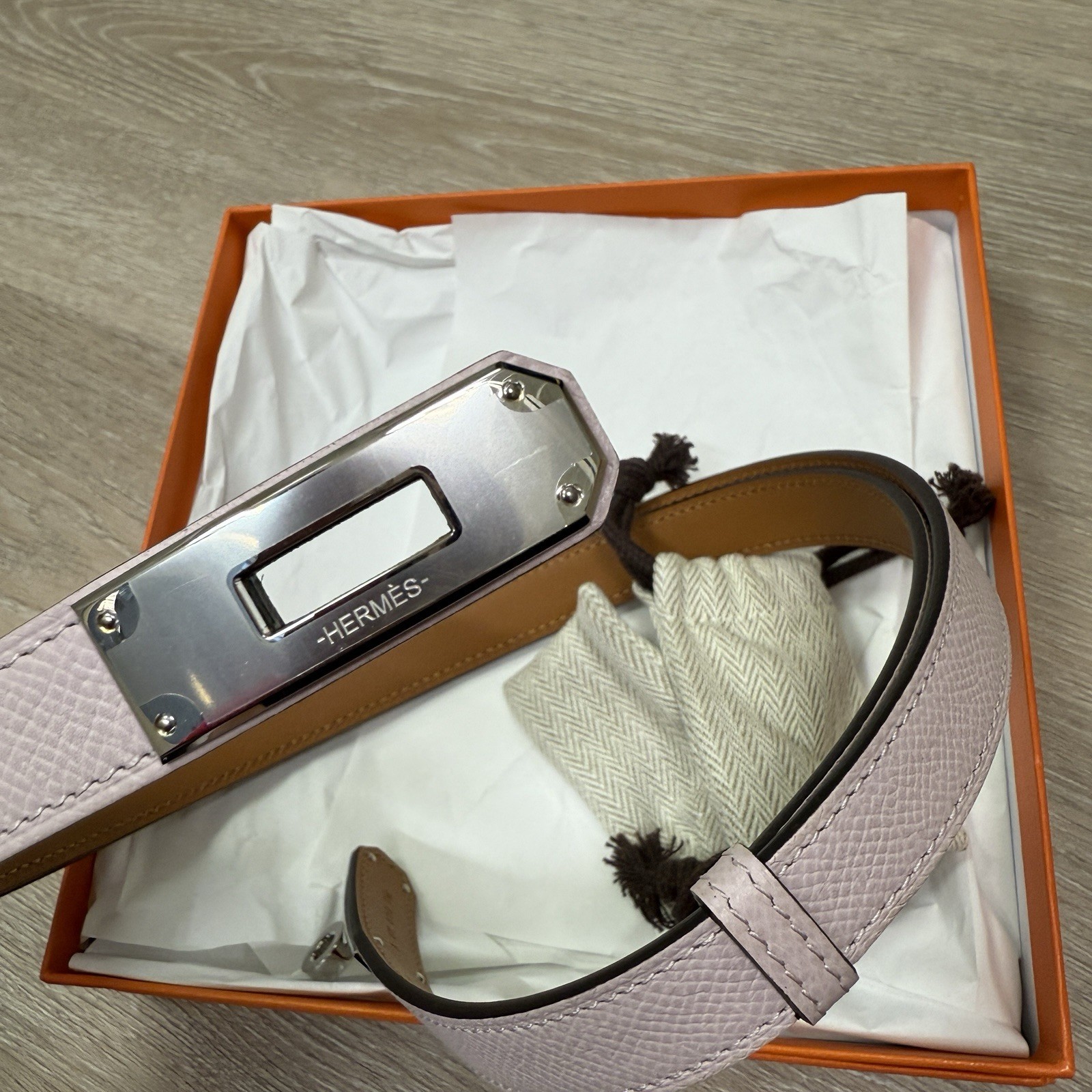 как выглядит Hermes Kelly Belt, Mauve Pale With Palladium Hardware, New In Box фото