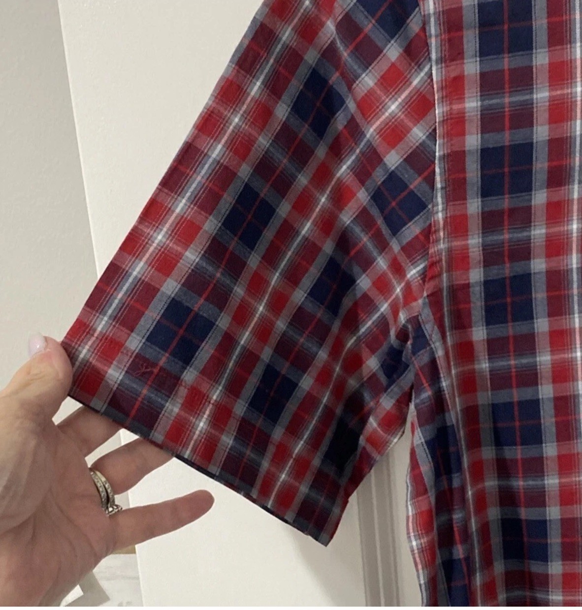 George Men s Wrinkle Resistant Red Blue Plaid Poplin Short Sleeve Shirt Small