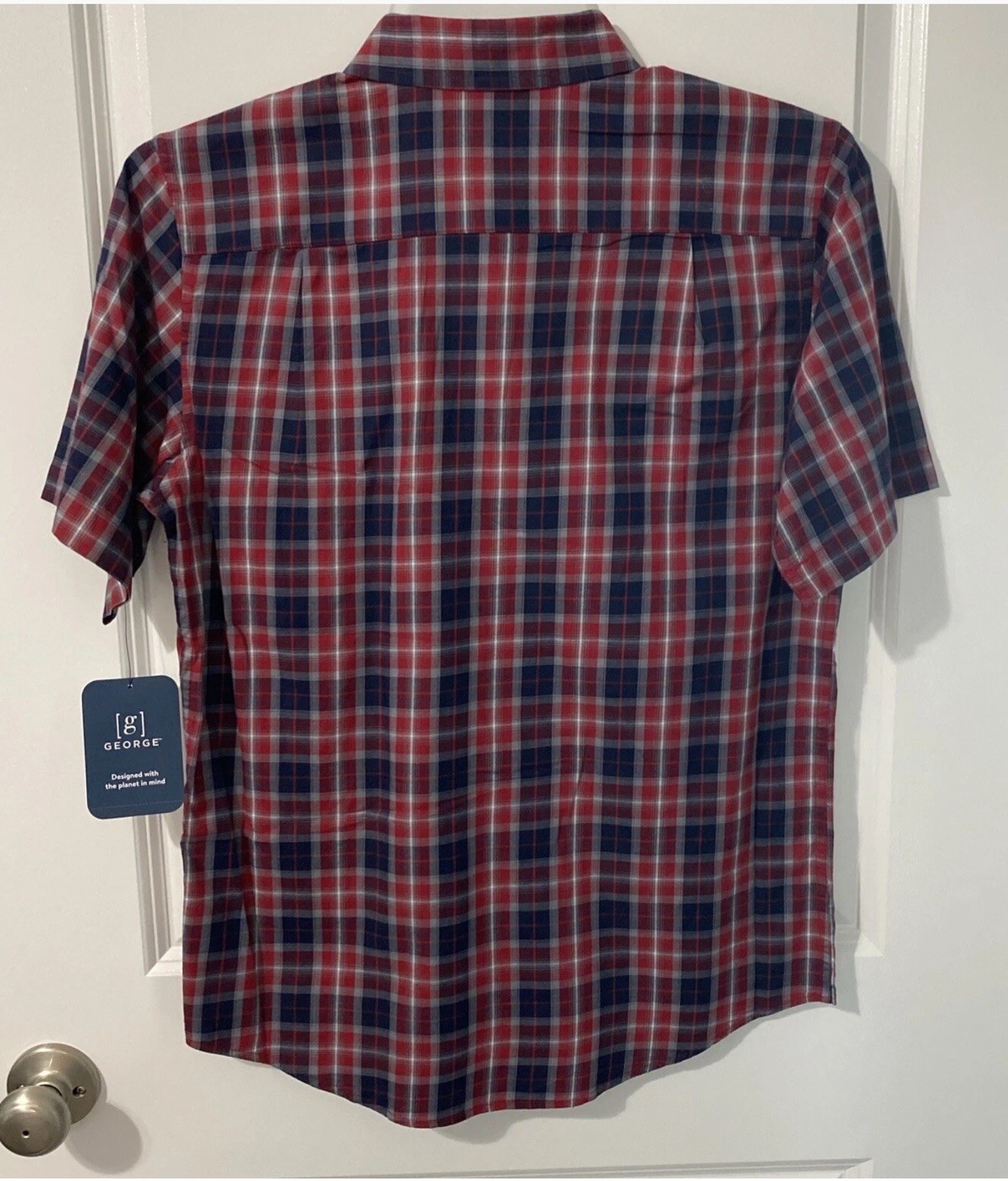 как выглядит George Men s Wrinkle Resistant Red Blue Plaid Poplin Short Sleeve Shirt Small фото