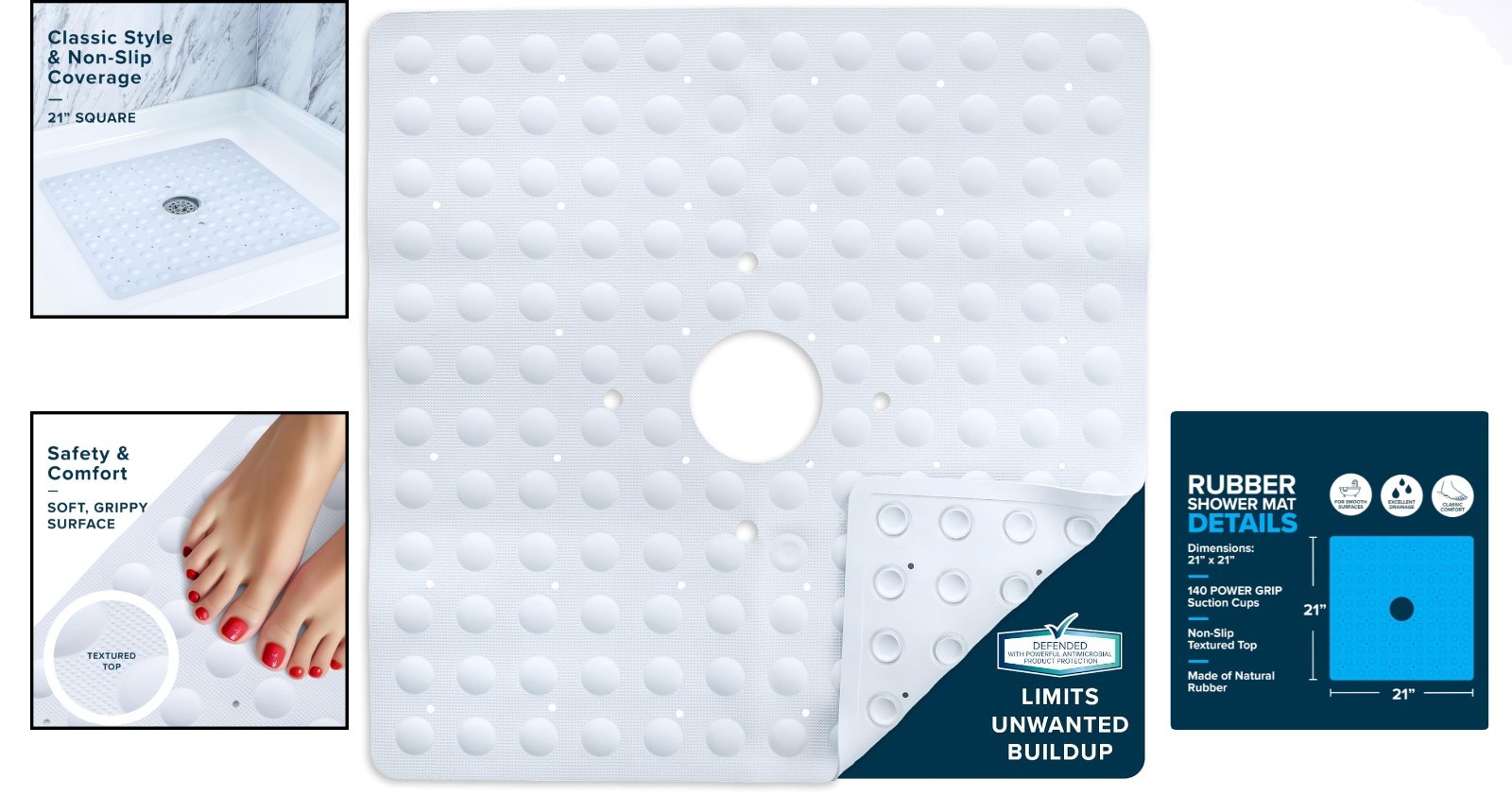 21 x 21 Non-Slip Natural Rubber Shower Mat with 140 Suction Cups - White