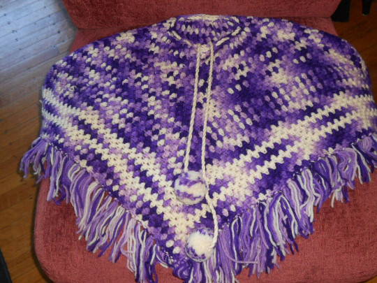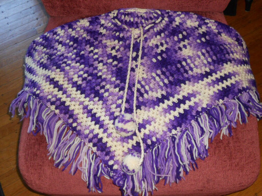 как выглядит Vintage Handmade Knitted Poncho Shawl Purple/Ivory Fringe Crochet 70s Youth Or S фото