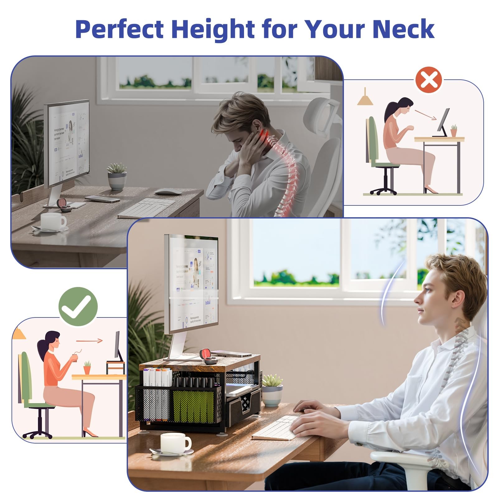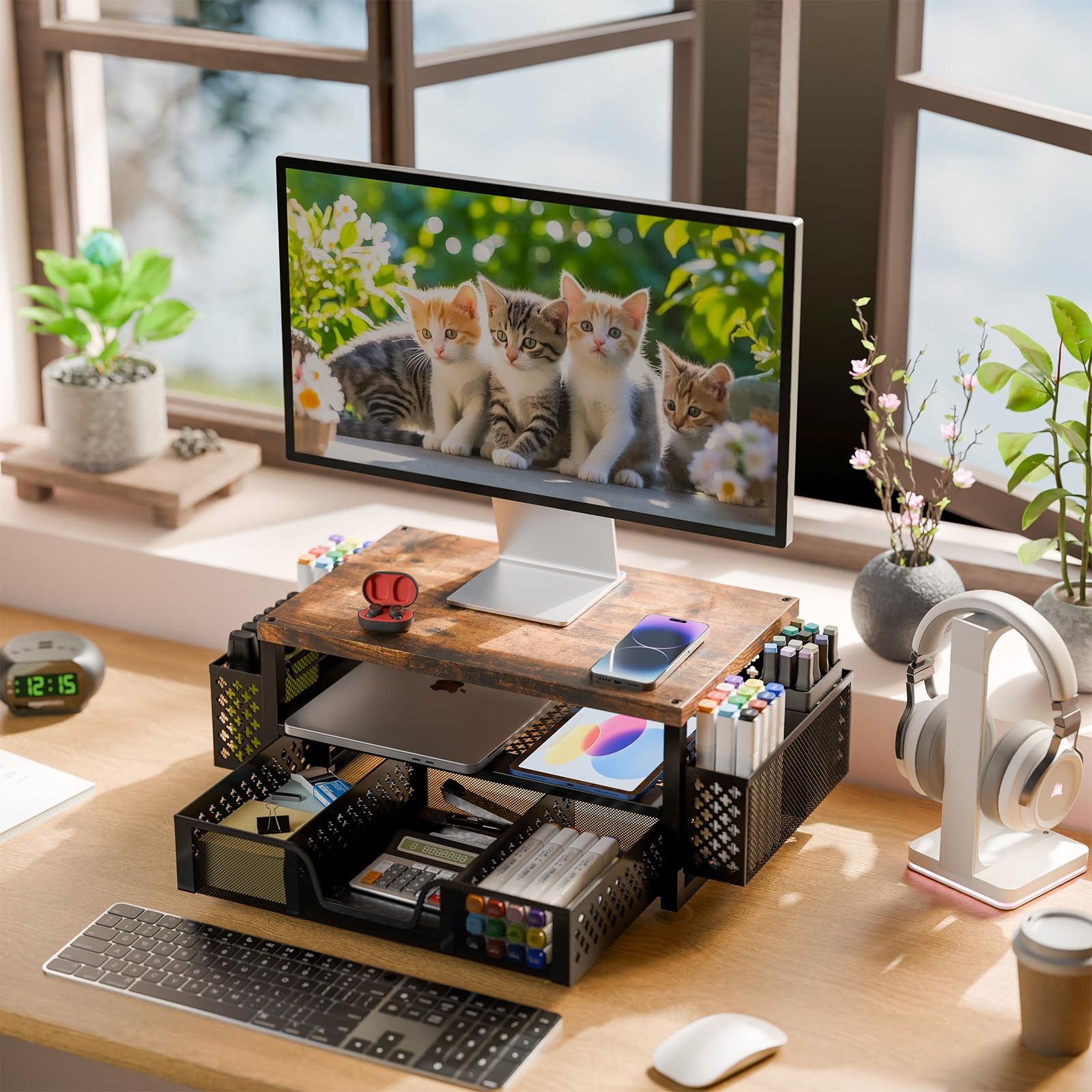 2 Tier Monitor Stand Riser, Wood Computer Desk Organizer with Drawer and Pen ...