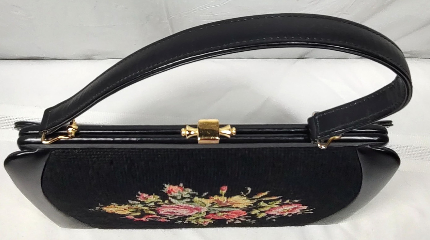 Vintage Needlepoint Floral Tapestry Purse Handbag Black Top-Handle Kiss Lock