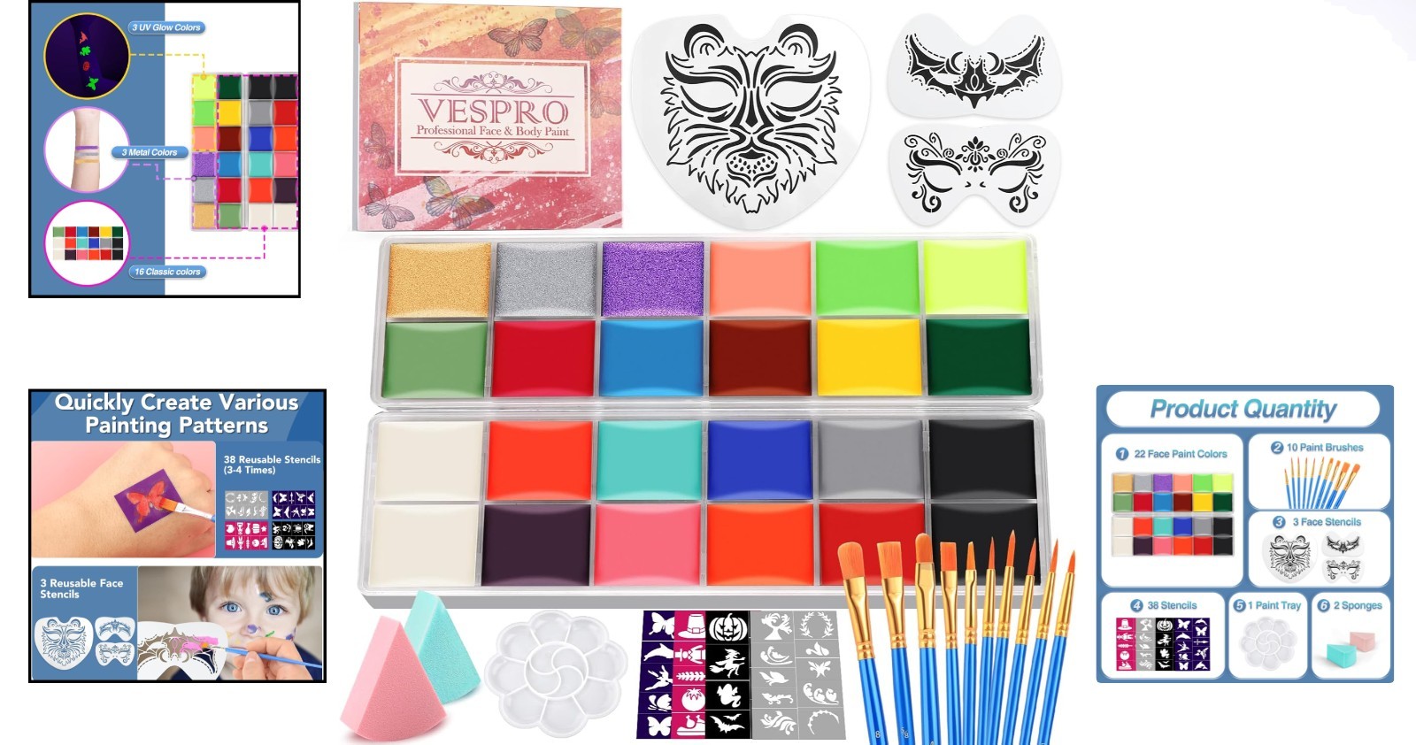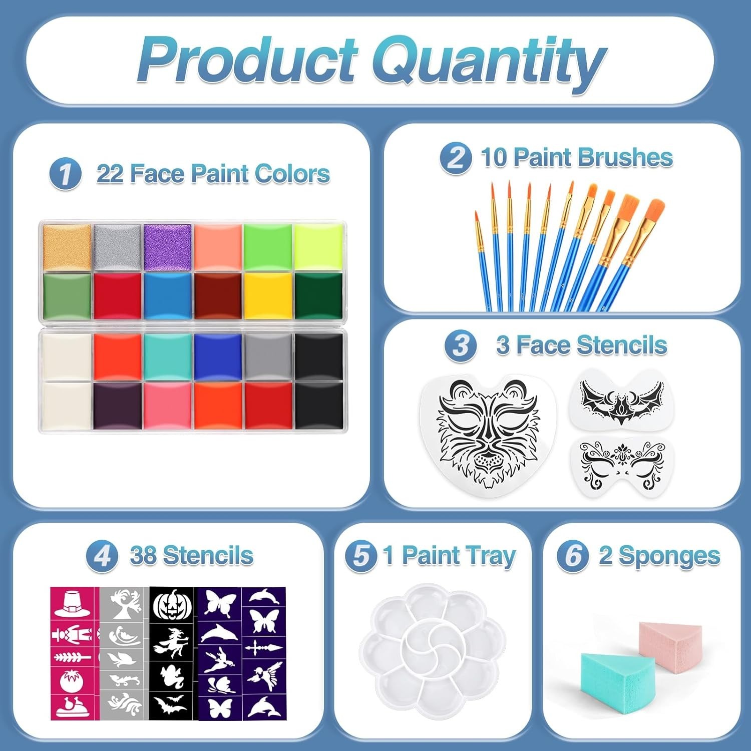 Vibrant 22-Color Face Painting Kit with Brushes Stencils Safe Non-Toxic