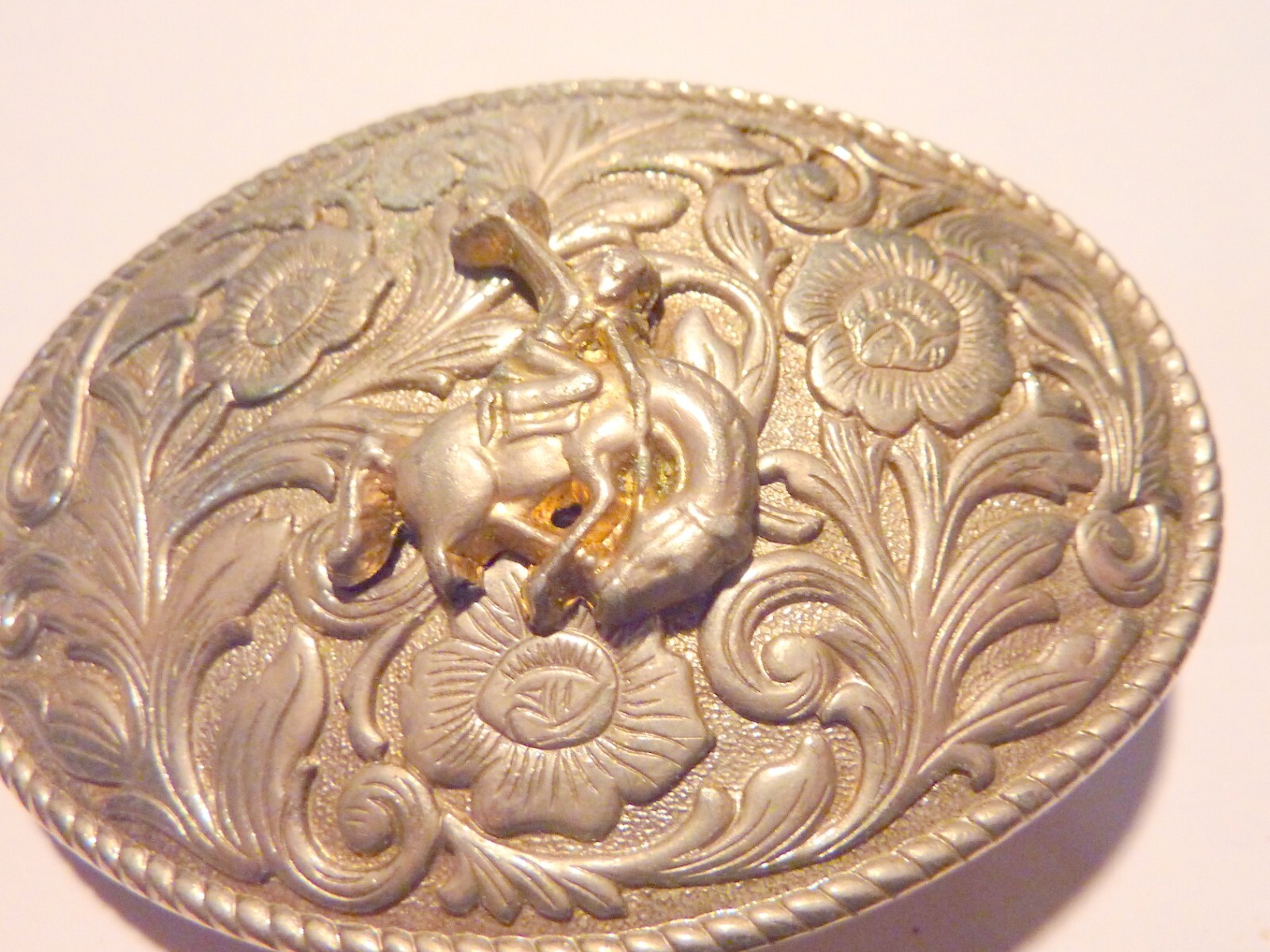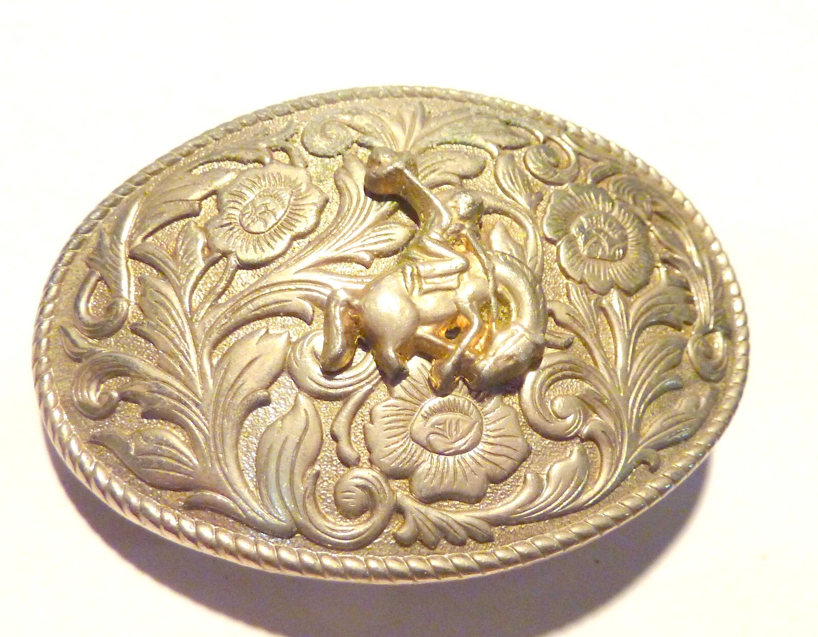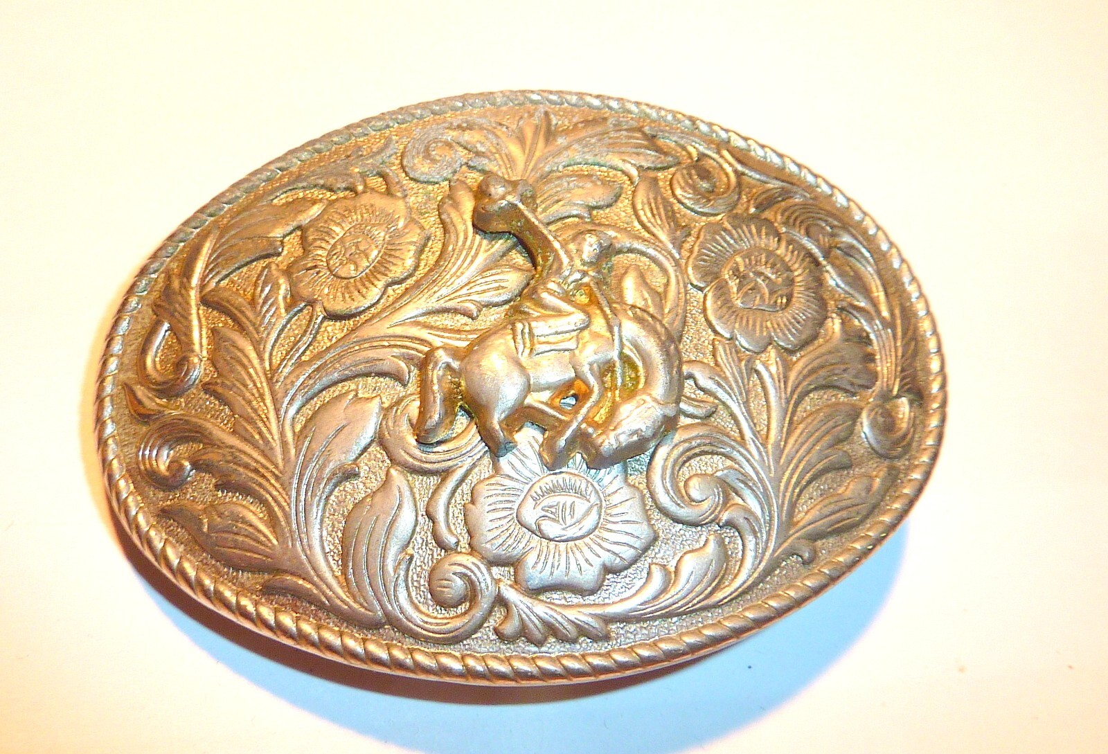 Bronco Vintage Brass Western Belt Buckle Cowboy Rodeo Horse Floral Scroll Oval