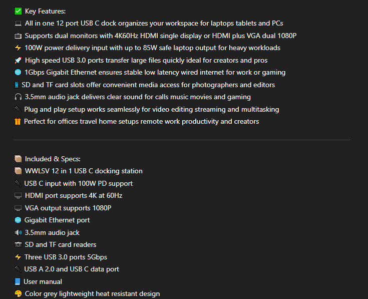 12 in 1 USB C Docking Station Dual Monitor HDMI VGA 4K60W PD Ethernet USB Hub
