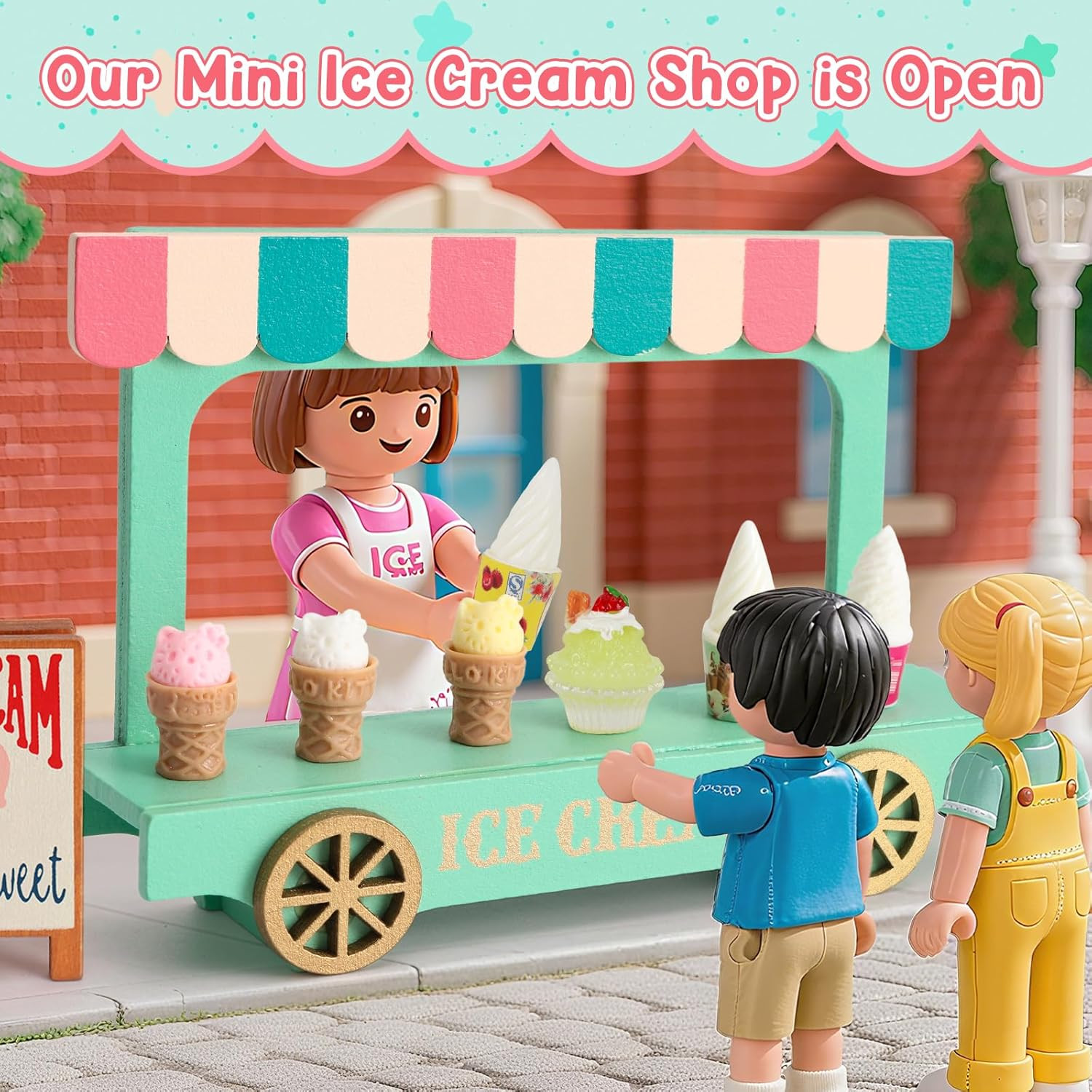 Mini Ice Cream Toy Sets for Play Kitchen - Miniature Food Truck with Wooden Cart