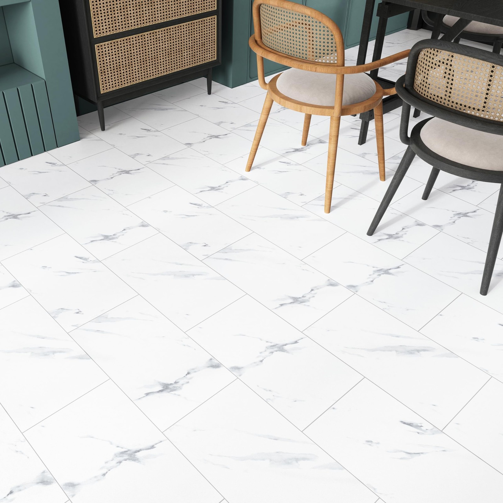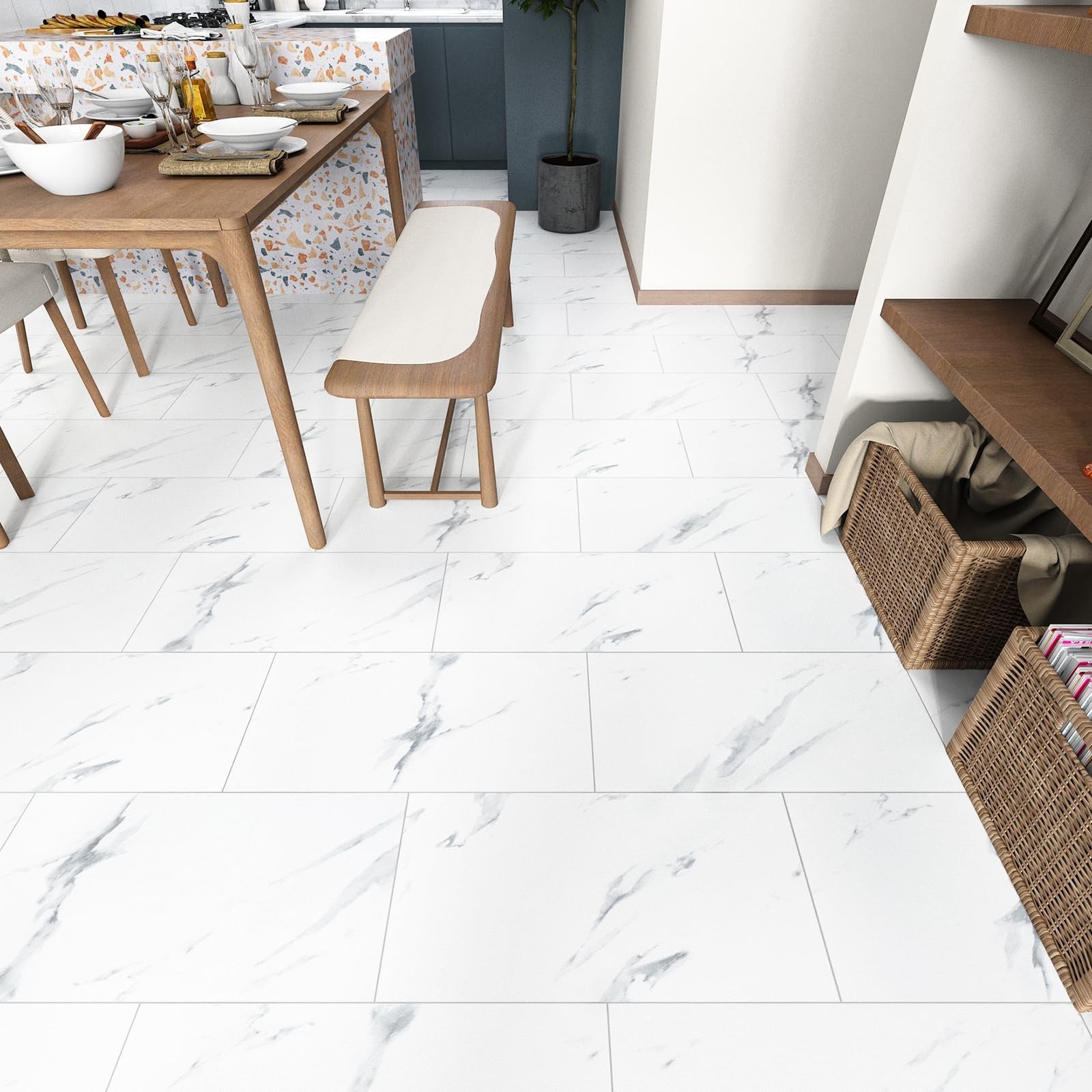 White Marble Peel and Stick Floor Tile Roll 24 x 12 Bathroom Vinyl Flooring...