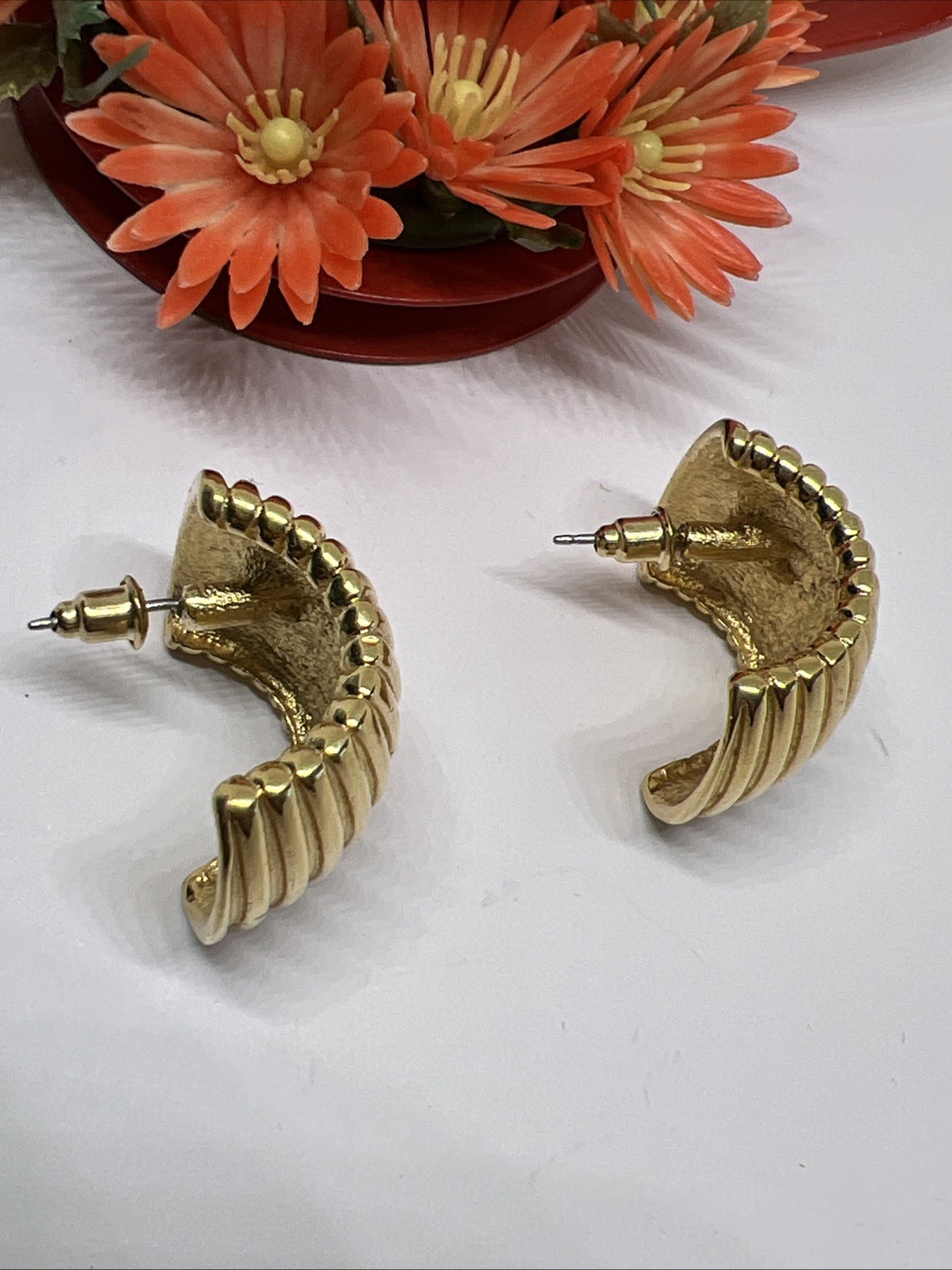 как выглядит Vintage Large Goldtone Ribbed Half Hoop Pierced Earrings 7858 фото