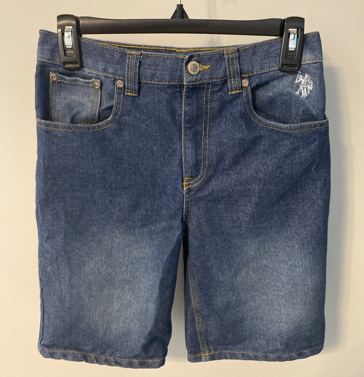 как выглядит U.S. Polo Assn. Boys 14 Straight Blue Jean Shorts Embroidered USA Flag Logo EUC фото
