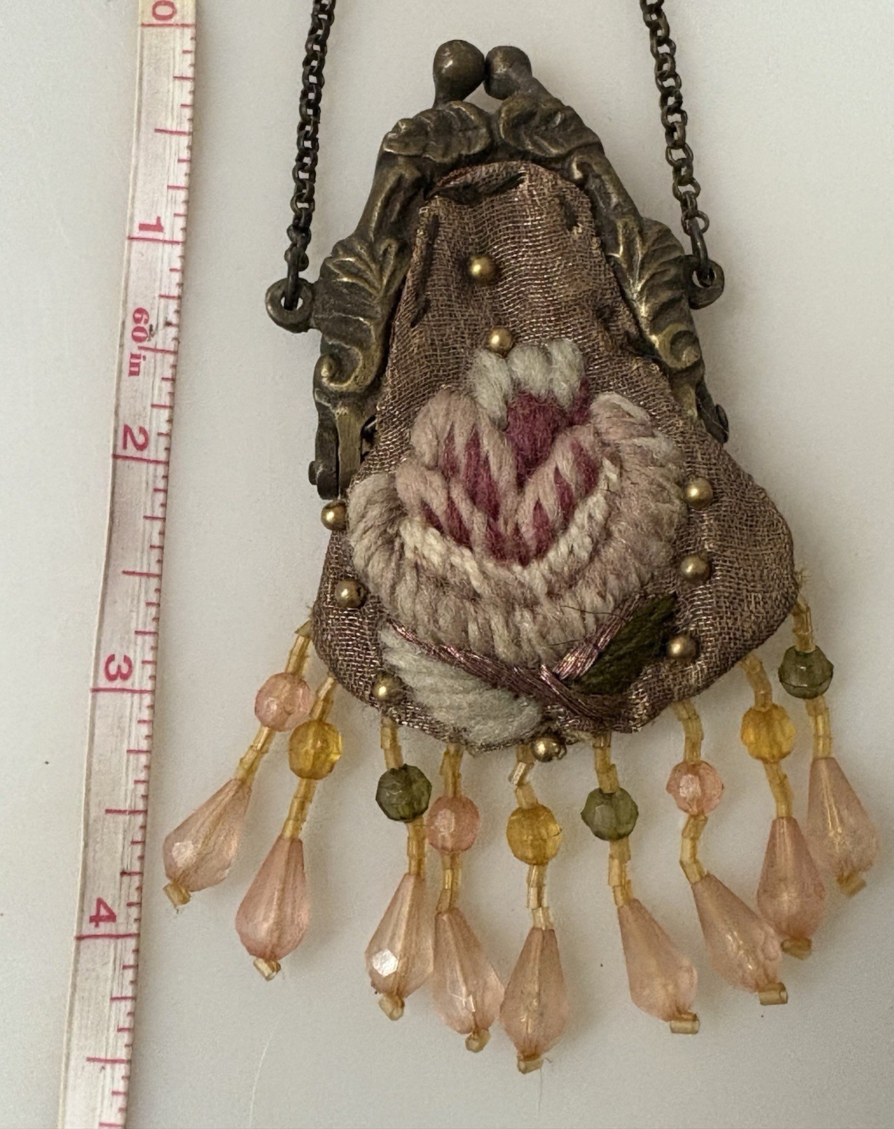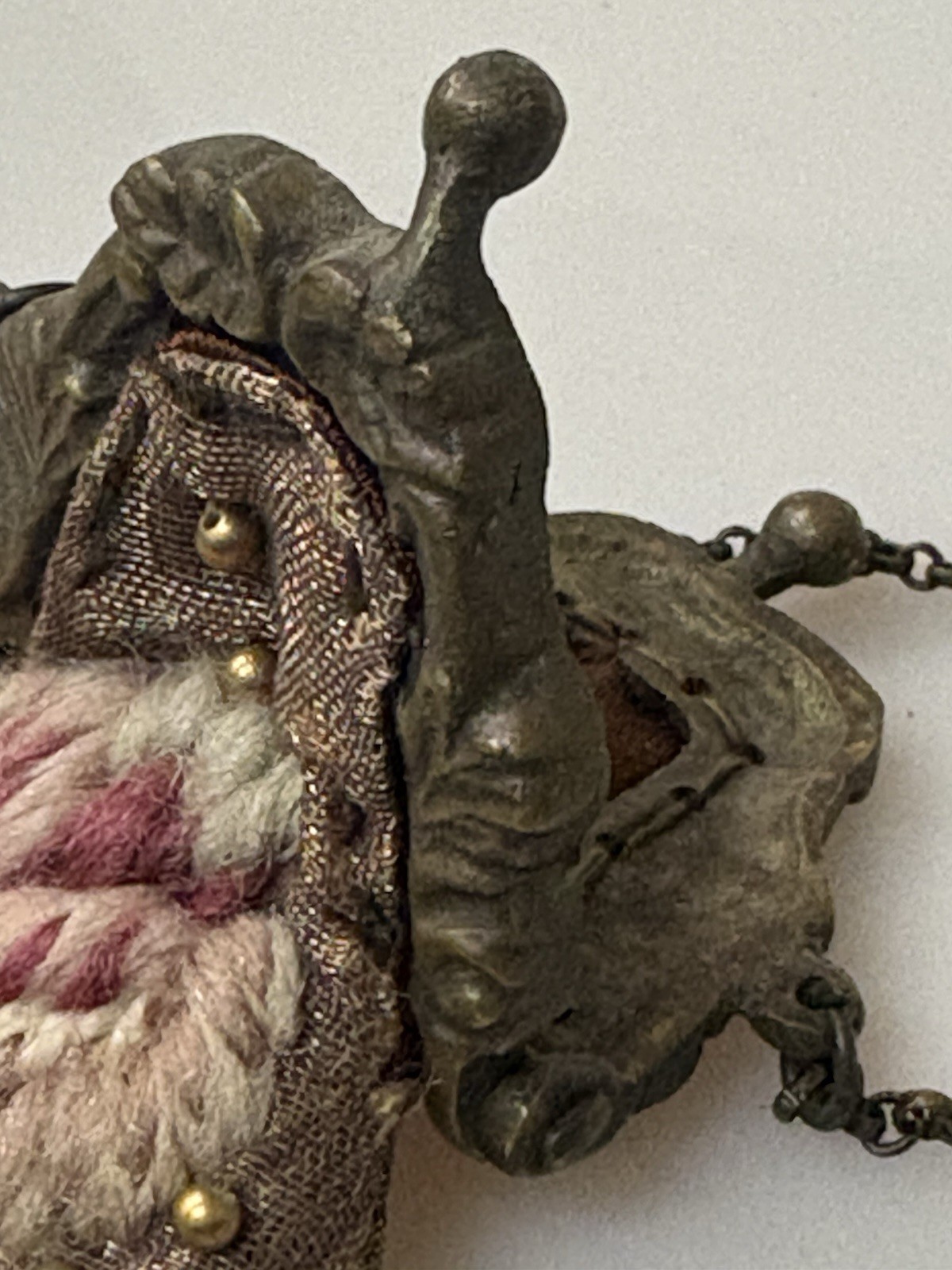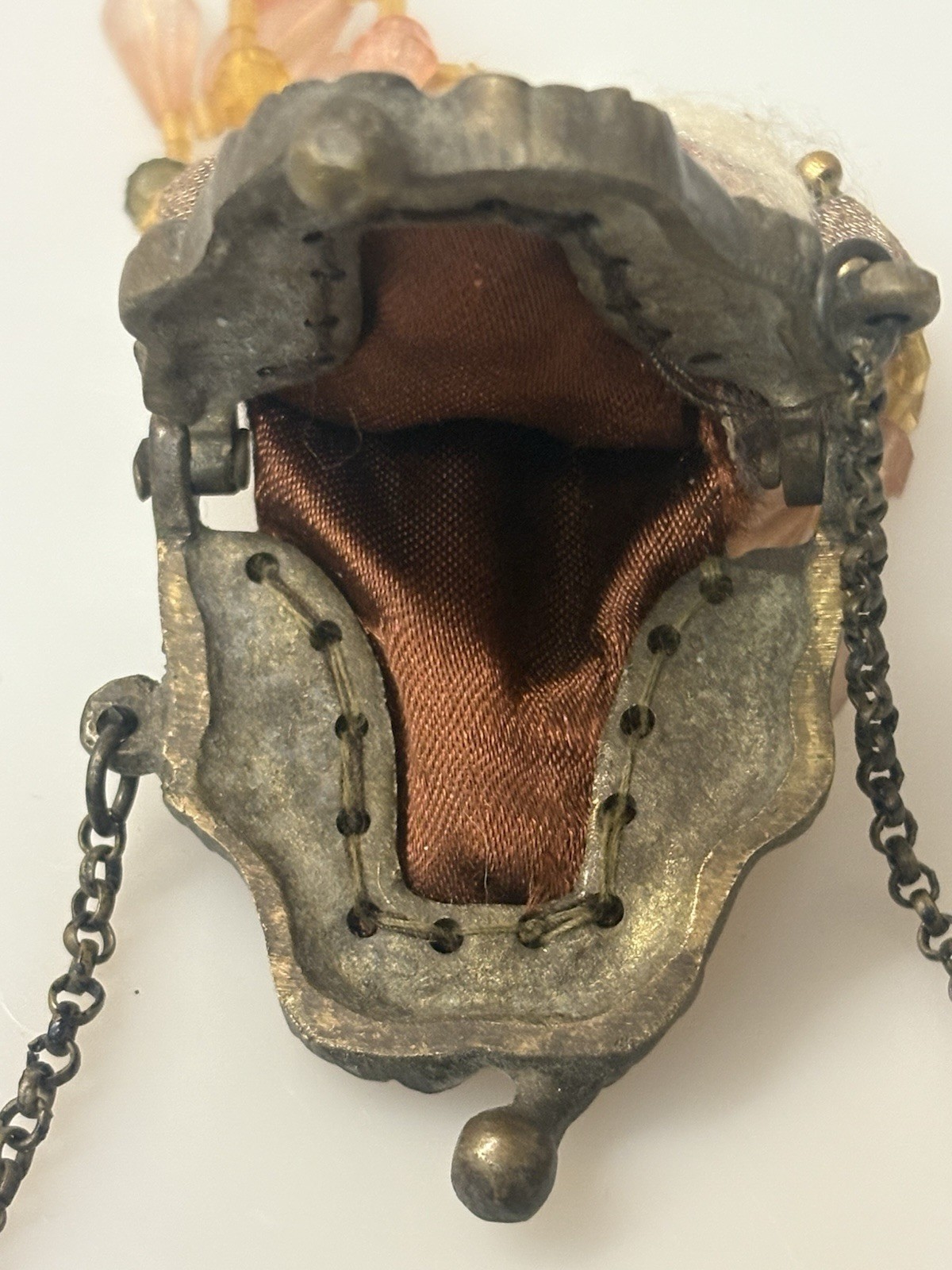 как выглядит VTG MINI COIN PURSE METAL CLOTH LINED W/ BEADED TRIM - VERY RARE FIND фото