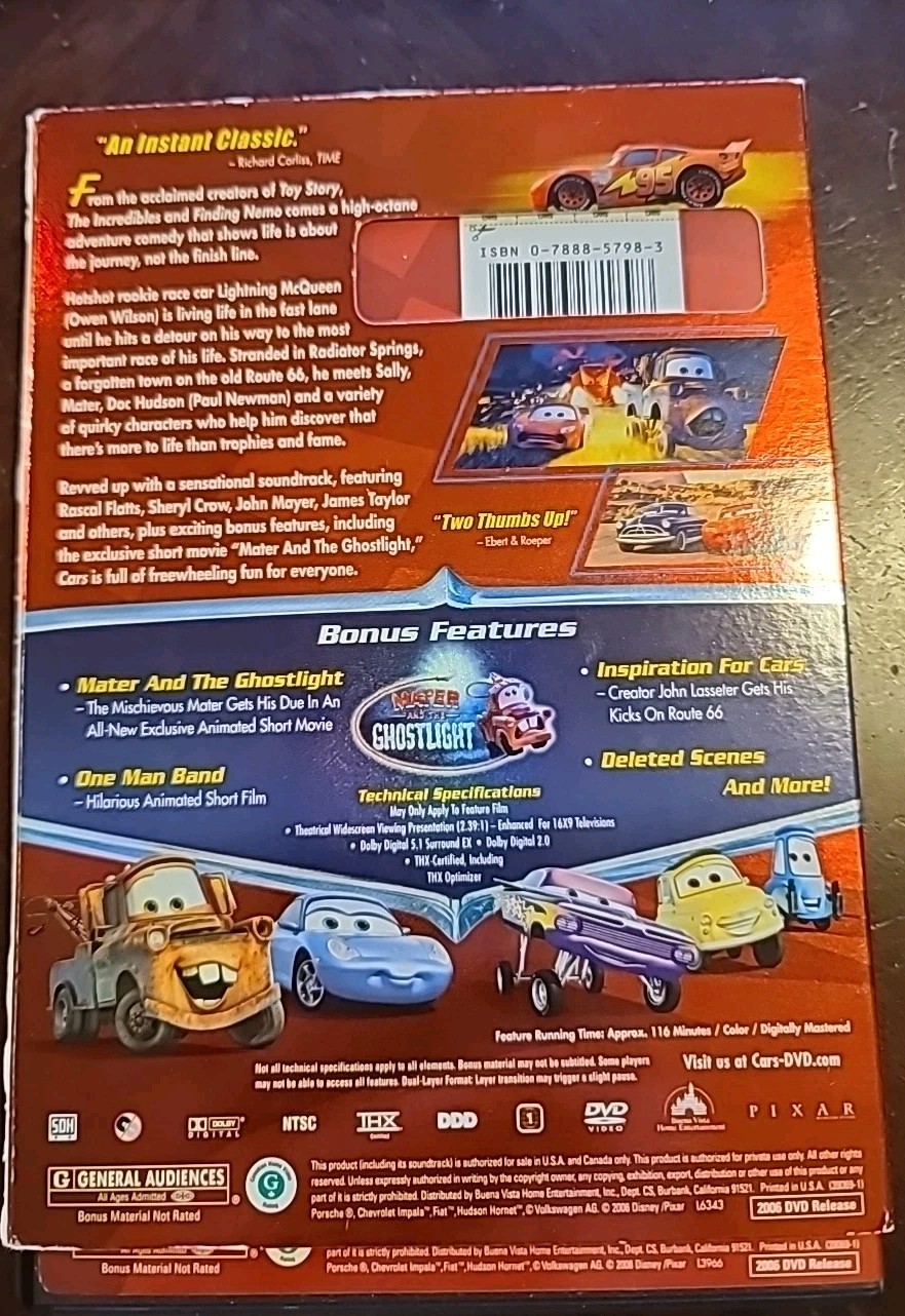 Cars DVD, 2006 Disney Pixar Widescreen Edition Complete In Case/Box