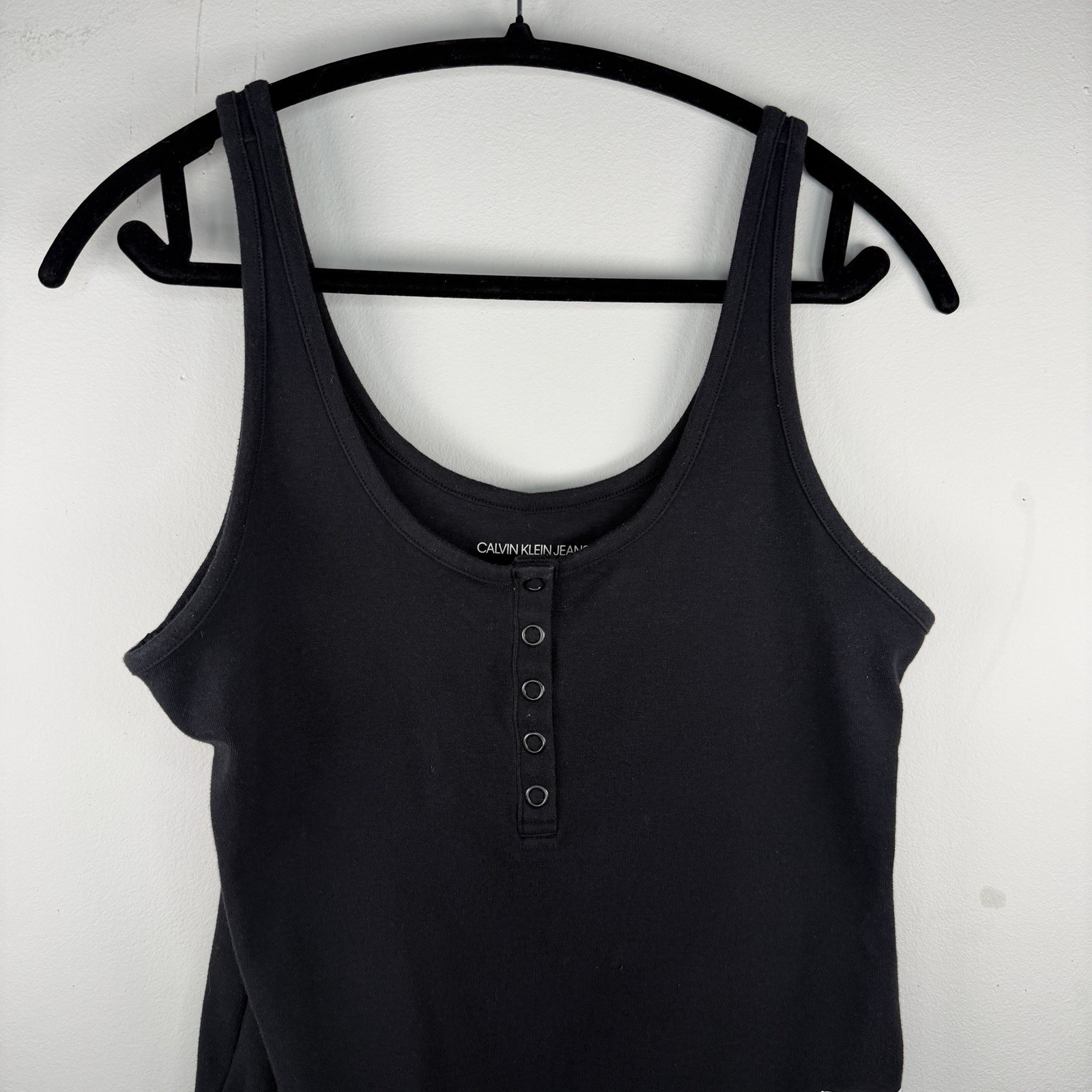CALVIN KLEIN JEANS Size L Stretch Cotton CK Logo Tag Thong Bodysuit Black Button