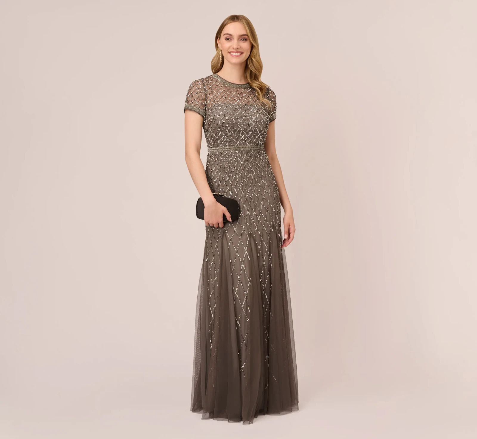 как выглядит Adrianna Papell Cap Sleeve Beaded Gown In Lead 10  340 фото