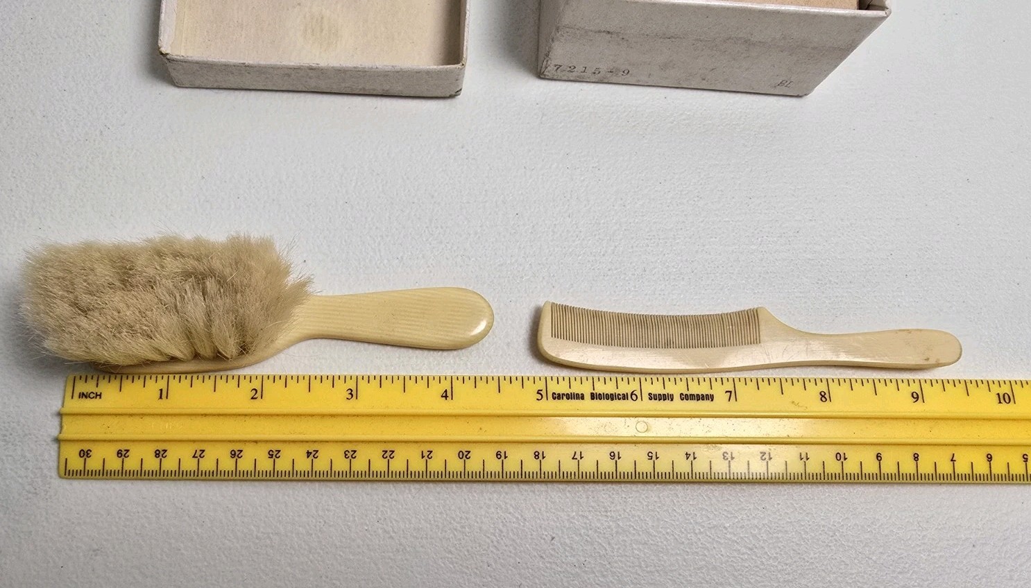 как выглядит Vintage Hand Painted Celluloid Baby Vanity Set Comb Brush In Original Box фото