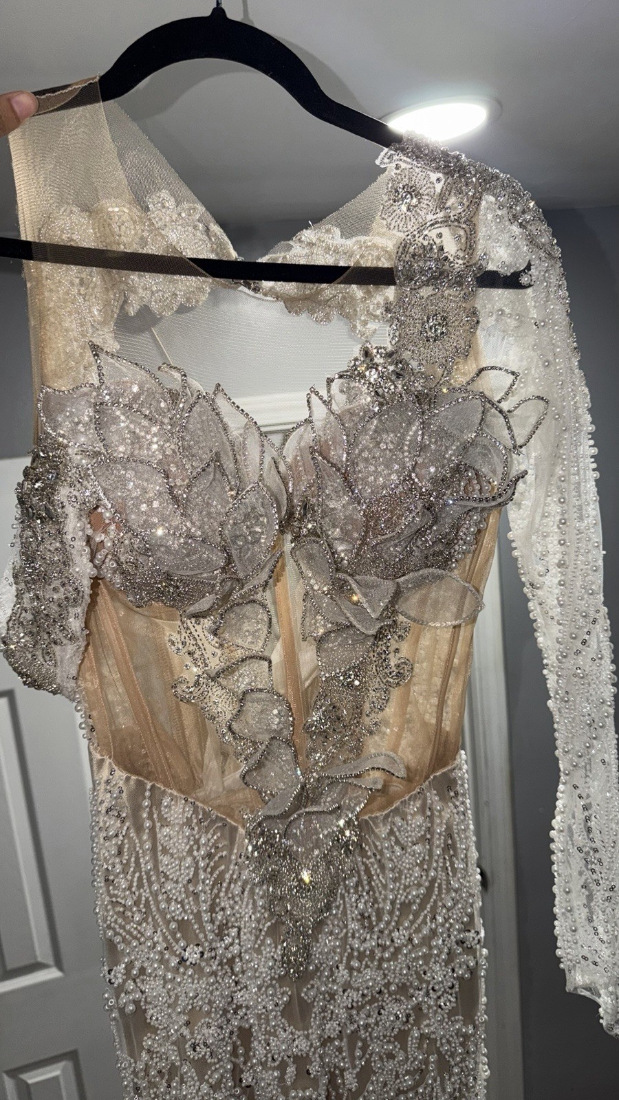 как выглядит Ivory Nude Beaded Lace One Sleeve Off-Shoulder Mermaid Wedding Dress with Train фото