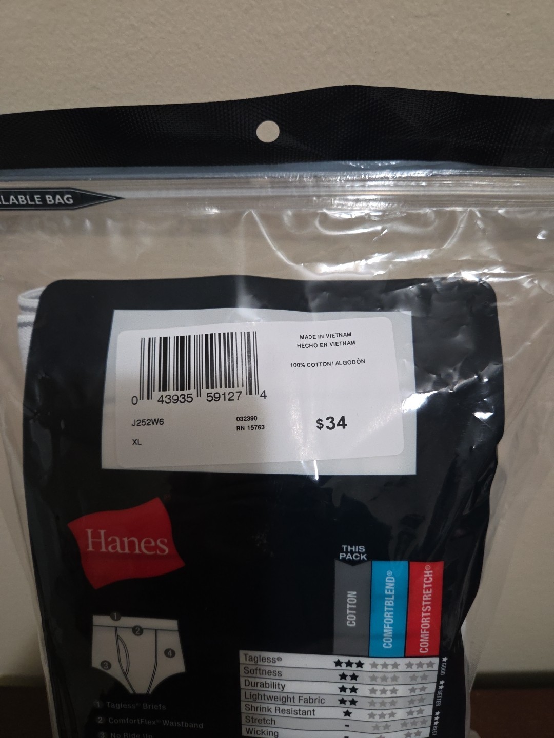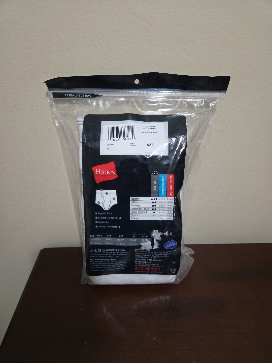 New In Package 6-Pack Men's Hanes Tagless Cotton Briefs Size XL White Wicking