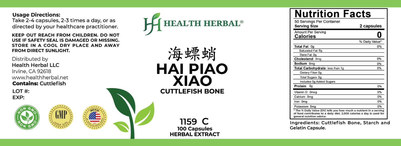 2 Bottles Health Herbal-Hai Piao Xiao/Cuttlefish Bone 100 Capsule/Bottle