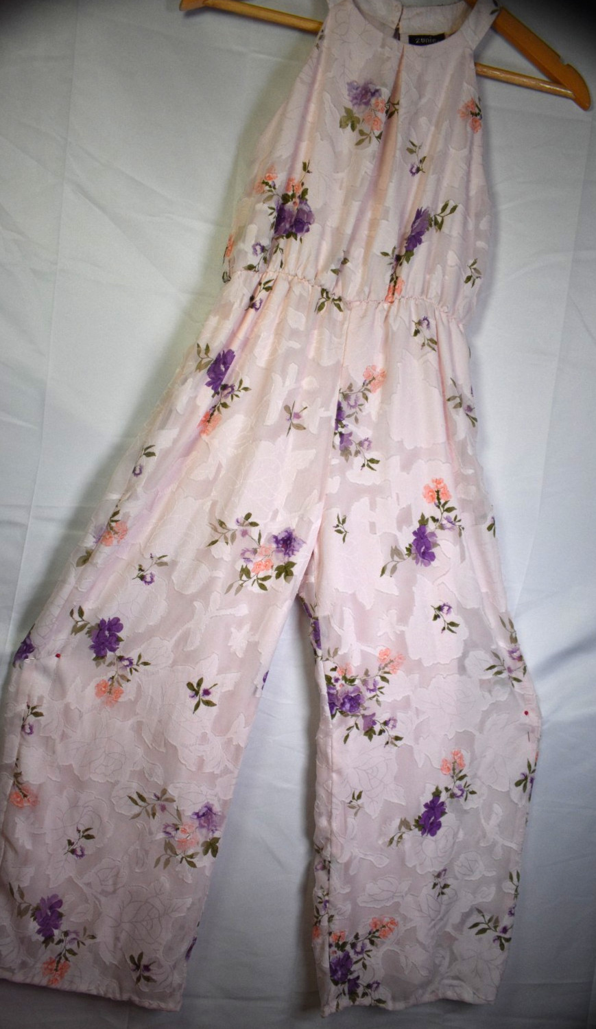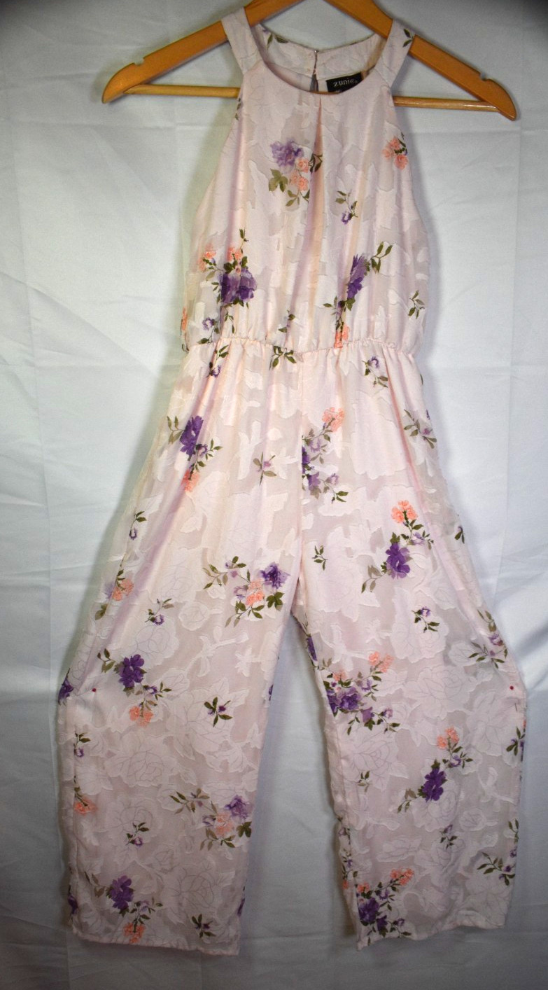 как выглядит Zunie Girls Jumpsuit Size 10 Pink Floral Jacquard Wide Leg Halter Sleeveless фото