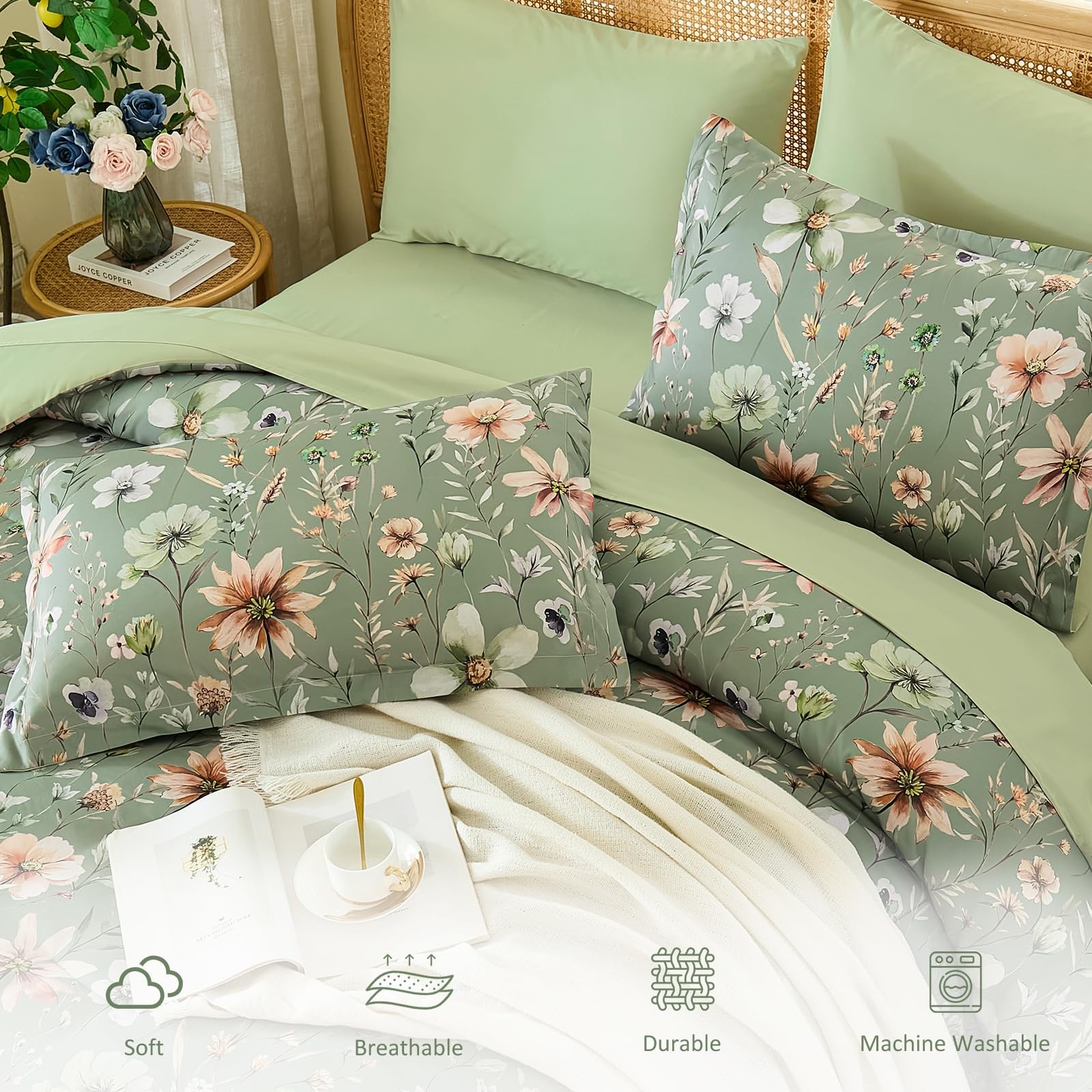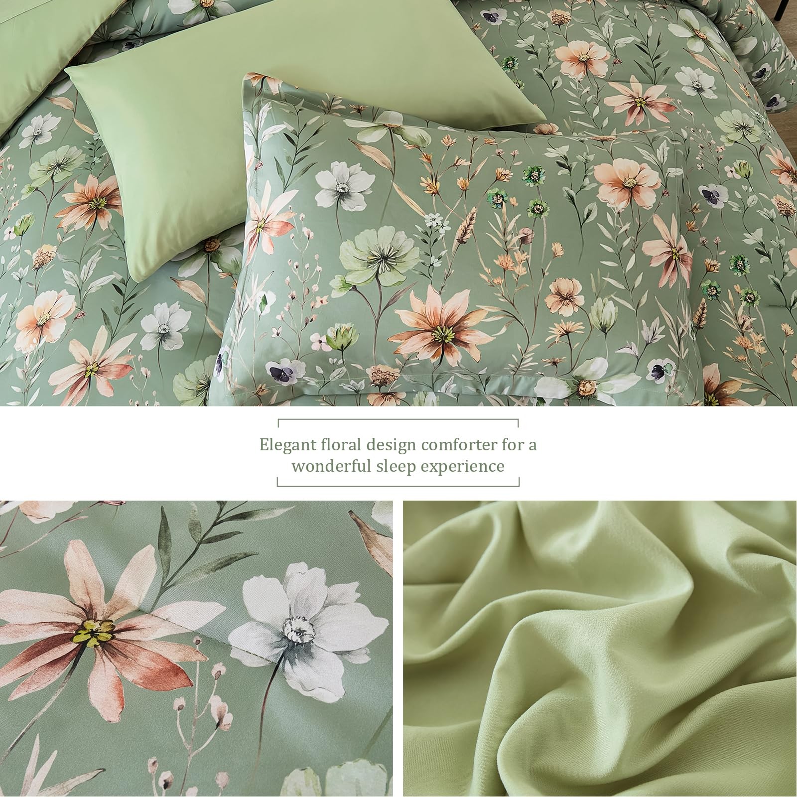 Queen Floral Comforter Set 7 Pieces,Sage Green Floral Comforter with Set,Flow...