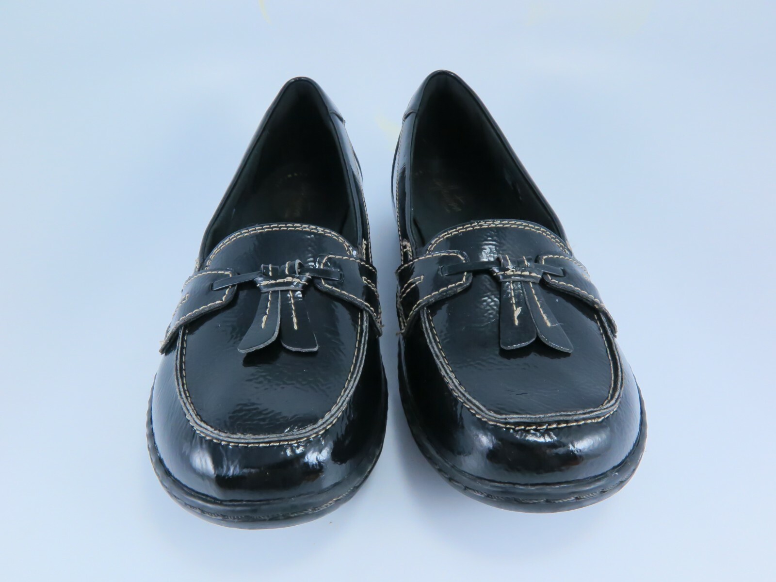 как выглядит Clarks ASHLAND BUBBLE Tassel Loafer Womens Size 8M Black Patent Leather Slip-ons фото