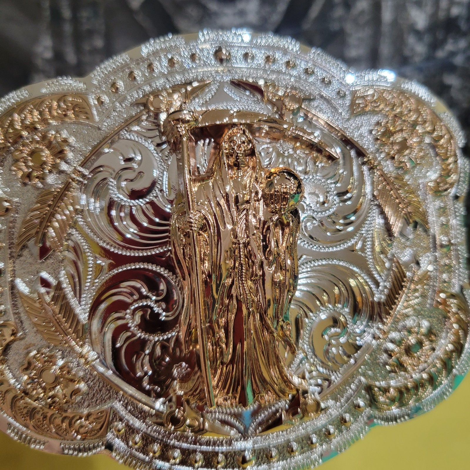 как выглядит Santa Muerte belt Buckle Grim Reaper Buckle Rosetone Silver Heavy Zinc Alloy фото