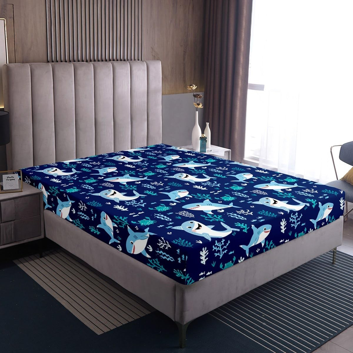как выглядит Cute Shark Fitted Sheet Twin,Seaweed Coral Bedding Set 2pcs for Kids Teens Gi... фото
