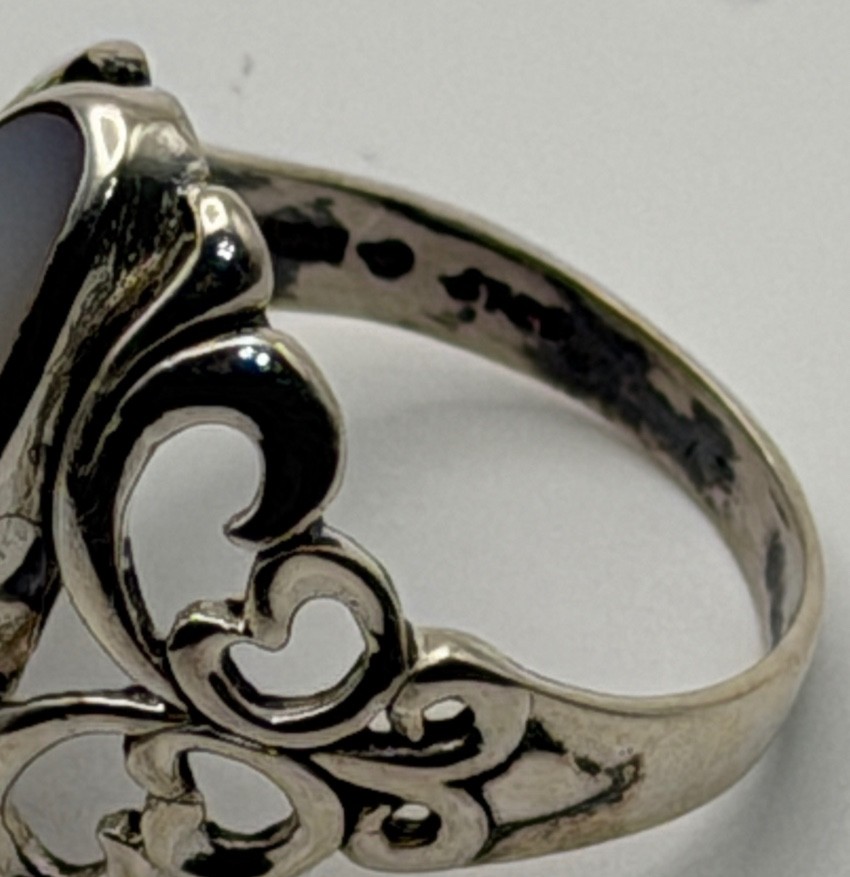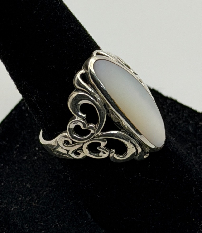 как выглядит Oval Mother of Pearl Sterling Silver Swirl Band Ring - Size 6 -Vintage фото