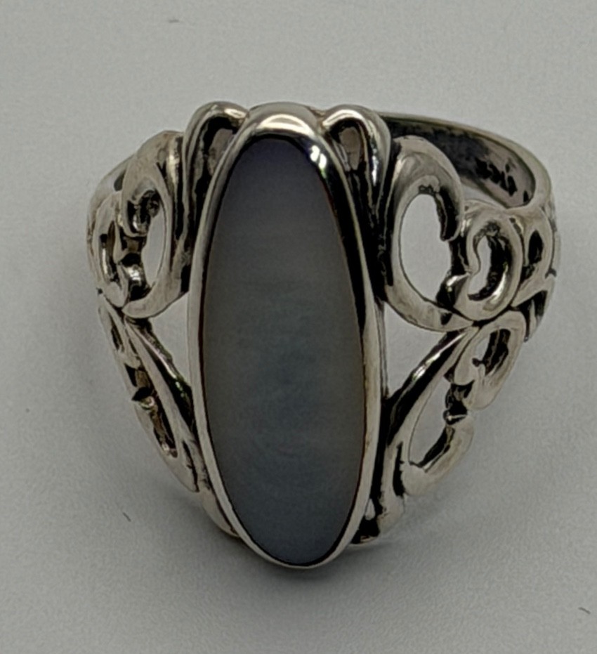 Oval Mother of Pearl Sterling Silver Swirl Band Ring - Size 6 -Vintage